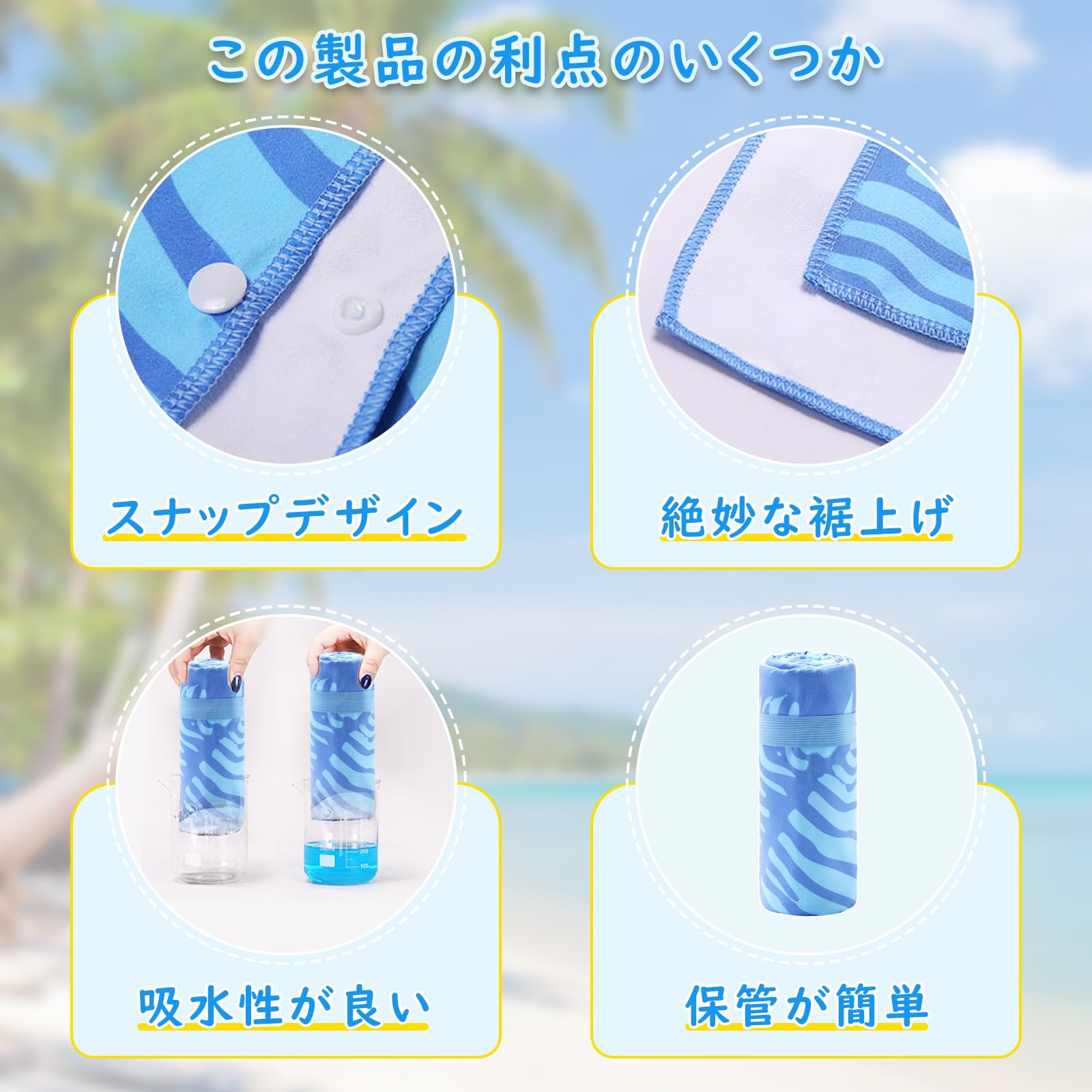 【吸水性&速乾性】このビーチタオルはマイクロファイバーで作られるので自身重量の2倍の水分を吸収して、見た目以上の吸水力を持ちます。厚さ僅か0.1cmの薄型設計で速乾性能も抜群です。