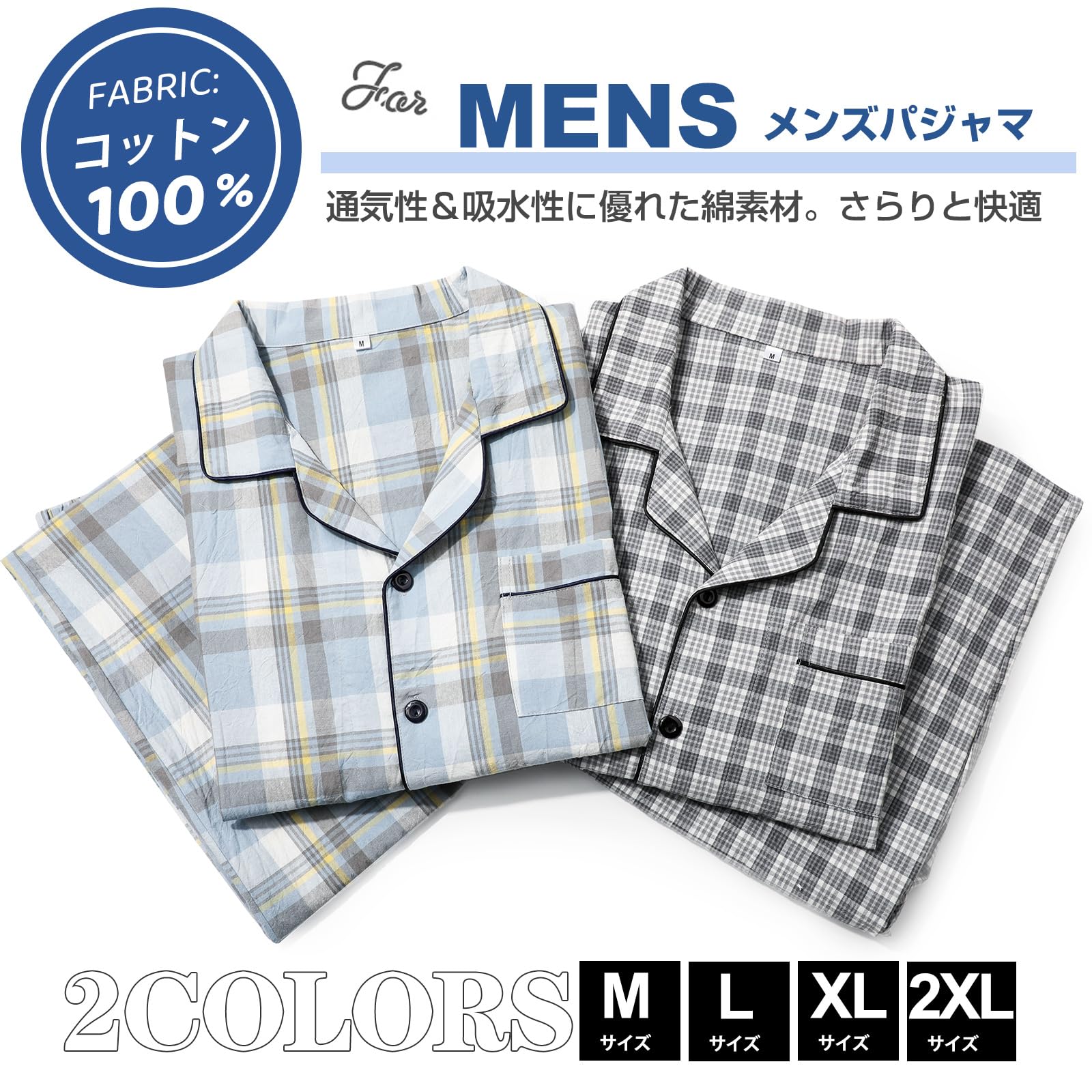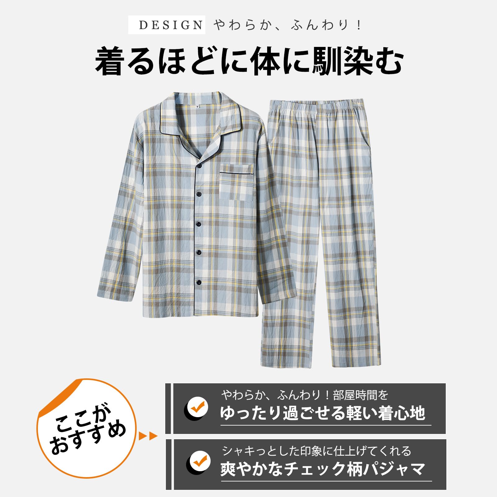 [Sumolux] パジャマ メンズ 綿100% 春 長袖 前開き ガーゼ ルームウェア 上下セット チェック柄 柔らかい 吸汗通気 春夏秋 部屋着 入院着