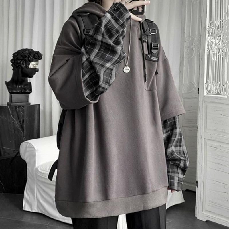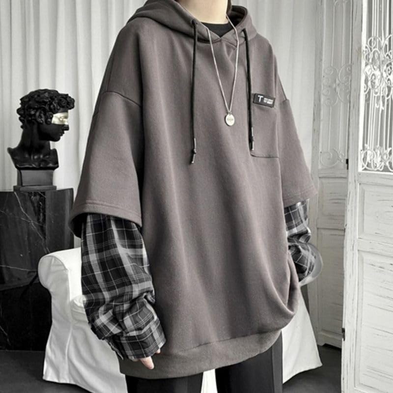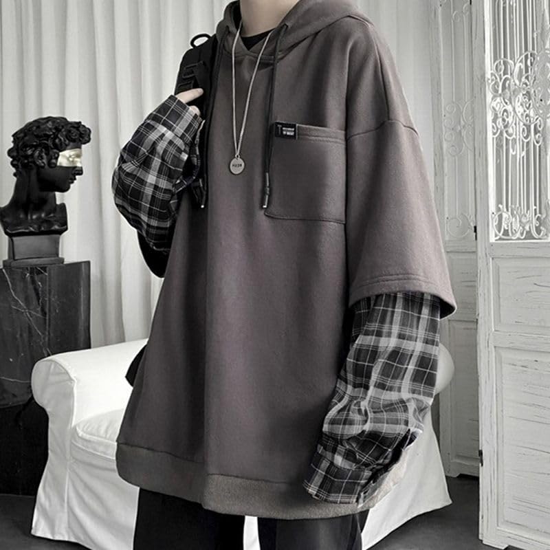 [FJLTDCP] パーカー メンズ 長袖 フェイクレイヤード 重ね着風 チェック柄 おおきいサイズ カジュアル ゆったり スウェット トップス プルオーバ
