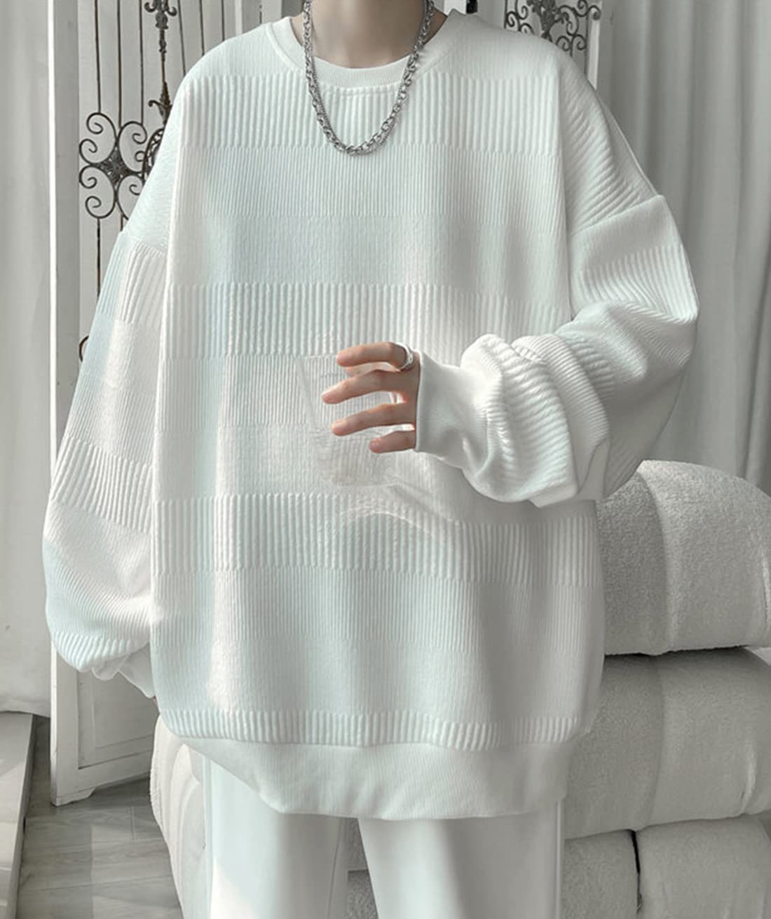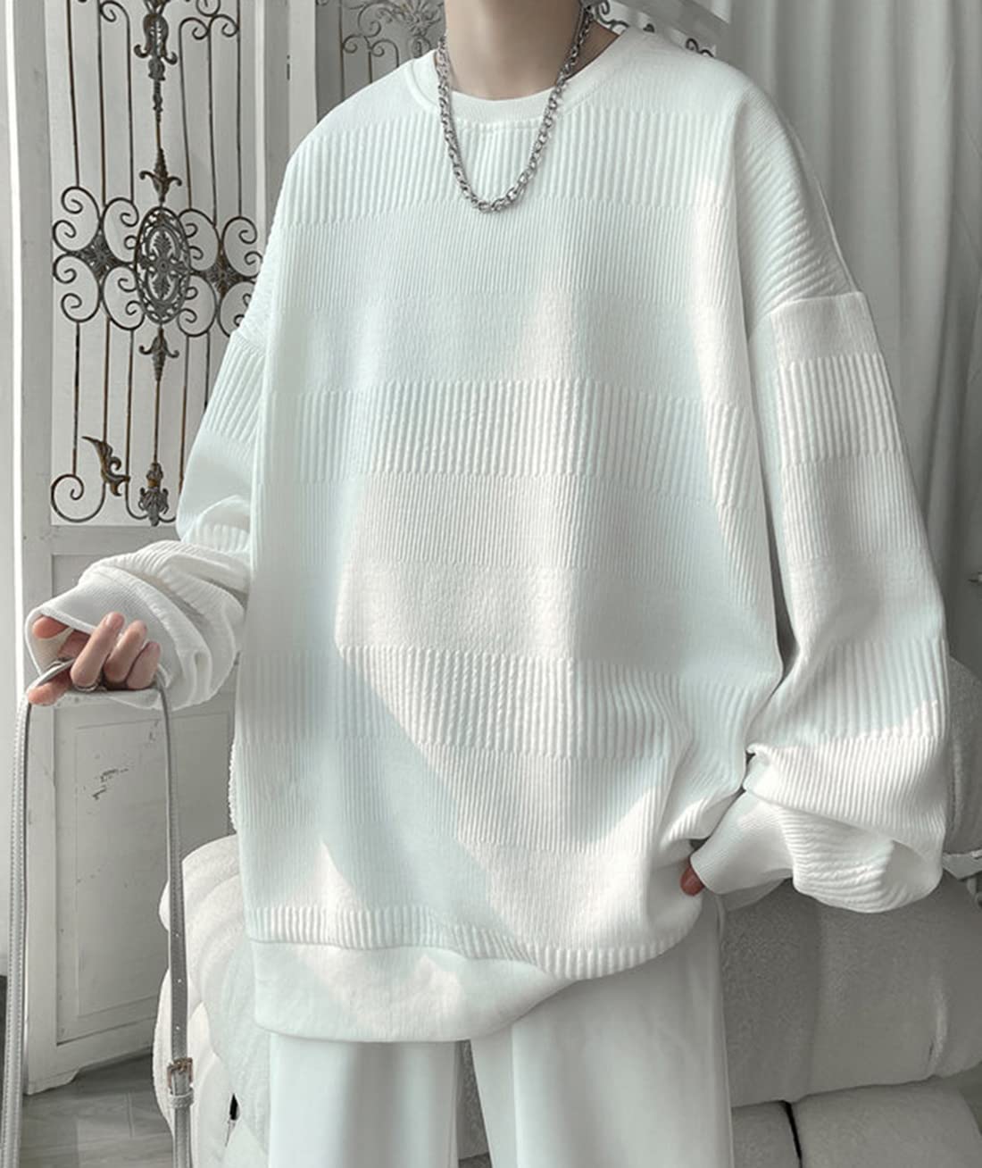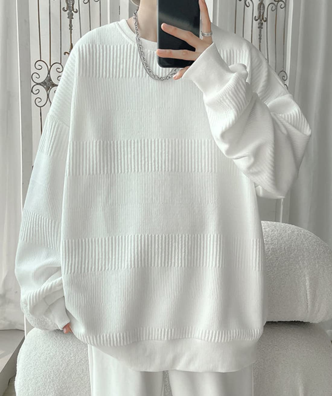 程よいクルーネックのデザインですっきりとした着こなしに、トレンド感があるおしゃれなトレーナーです!無地だけど、模様ありの素材で作られおしゃれなトレーナーです。