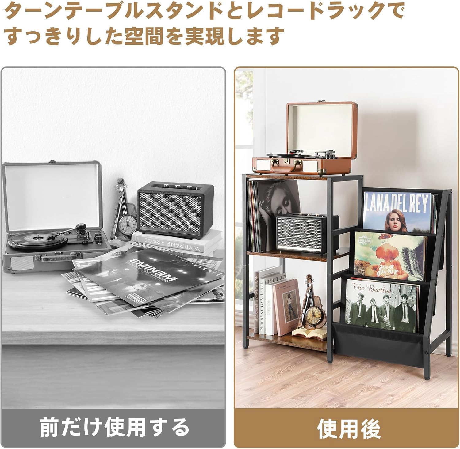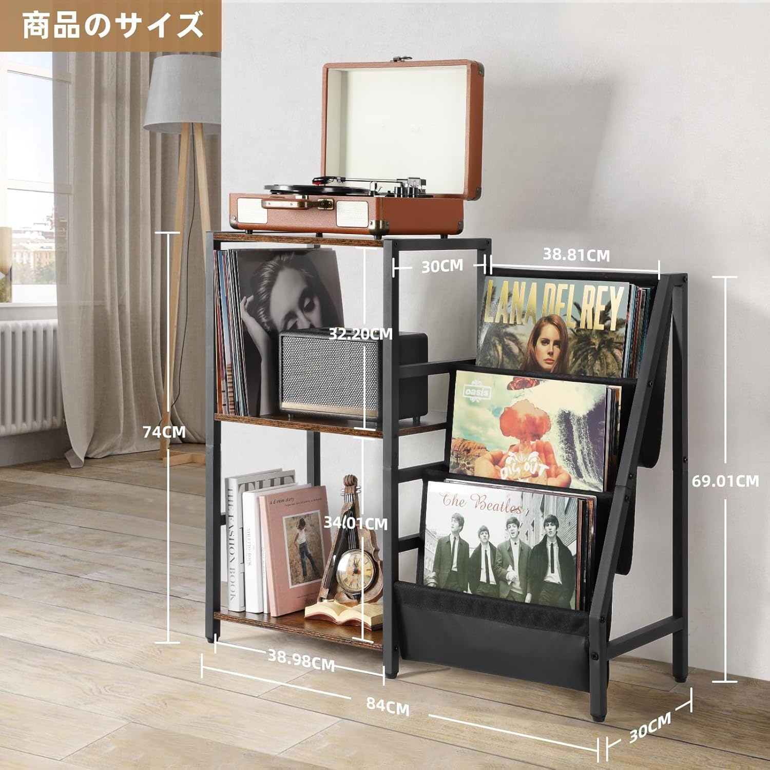 多機能アナログレコード収納棚:この3段の収納棚はレコードプレーヤー・アナログレコード・Bluetoothスピーカー・書籍・雑志・CDなどを格納するのに使うことができます。さまざまな収納のニーズに満たします。収納棚の一番上の平面にありあらゆるサイズのレコードプレーヤーに適します。