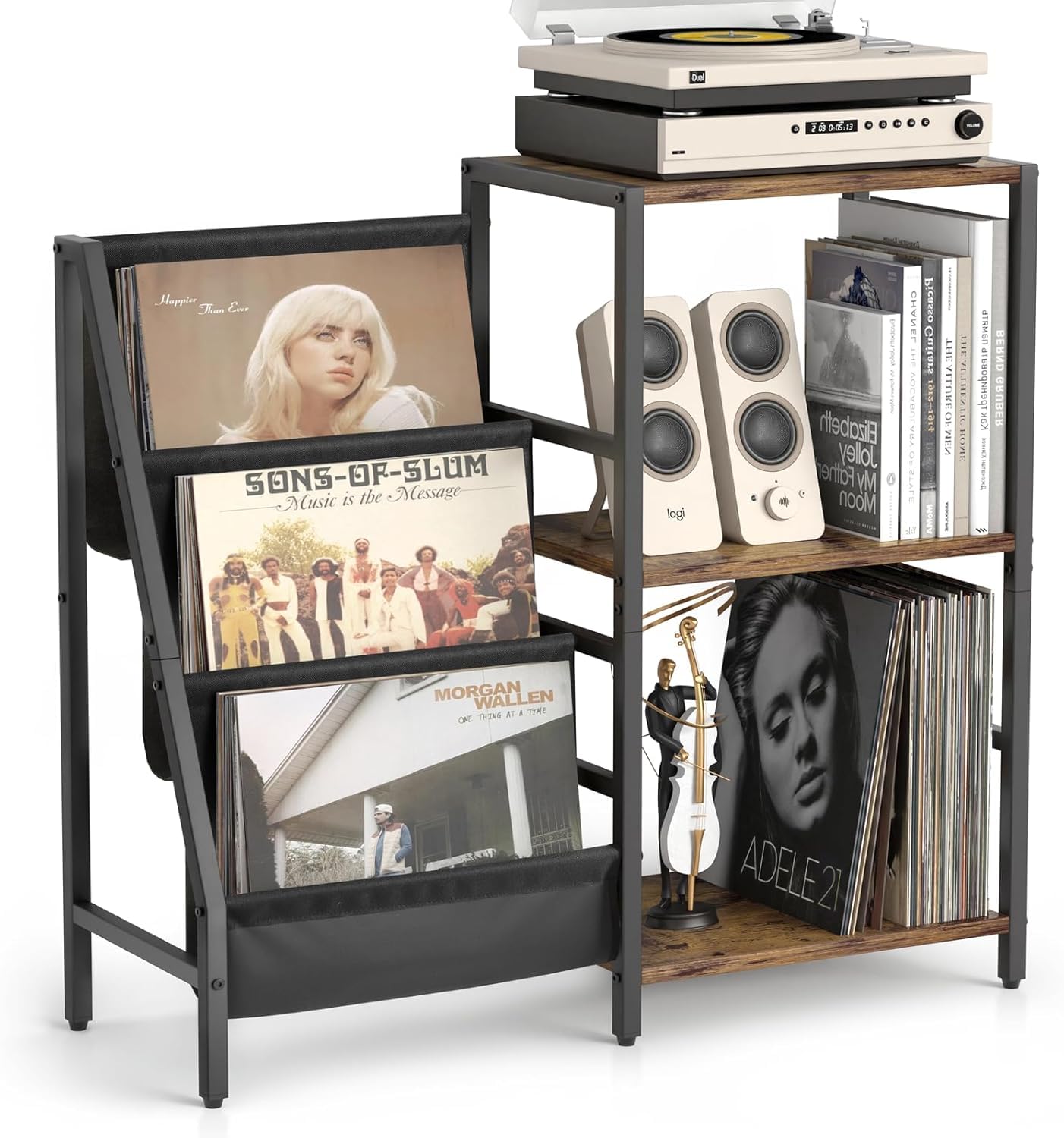 レコード収納ラック、3段レコードラック、200枚のレコードを収納でき、レコードプレーヤーの収納に適しています