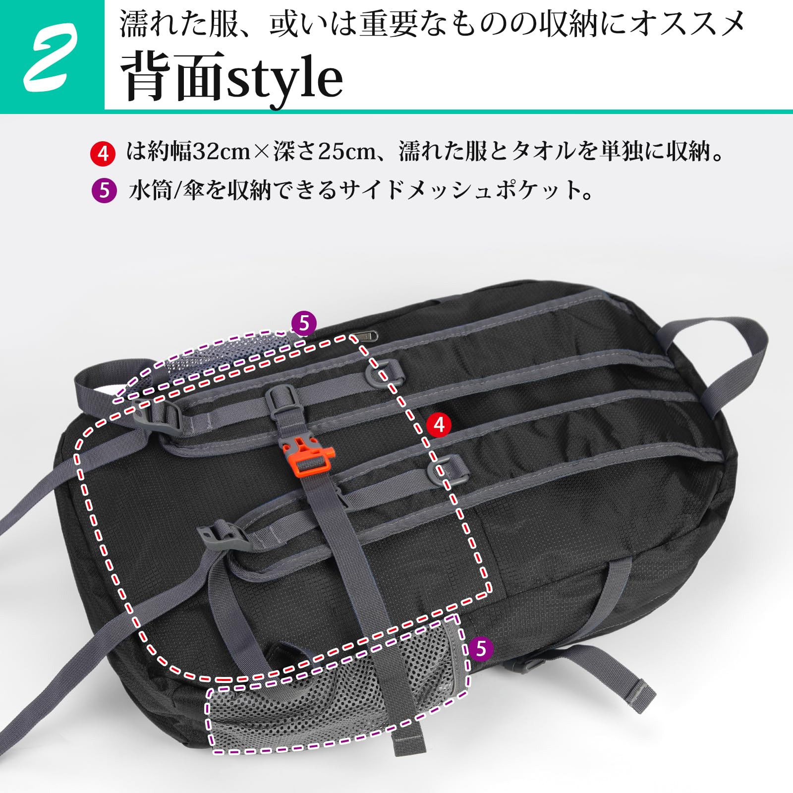 『大容量』:このバックには複数の間仕切りが含まれており、より多くの物を保管し、整理するに役立ちます。メインポケットのほか、正面ポケット2つ、水筒と折りたたみ傘のためのサイドポケット2つ、背中ポケットも乾湿分離機能を与えて、アウトドアや普段の持ち運びにぴったりな大きなリュックサック。