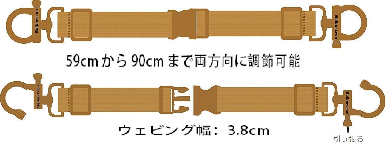 調節可能な長さの範囲:59cm-90cm。 ウェビング幅:3.8cm;