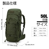 【防水性能】ミリタリーリュックサイズ:L29xH72xD23cm、容量:50リットル。生地は耐水性のある600Dポリエステル。耐摩耗性に優れ、長時間の使用でも色落ちしません。縫製は耐久性と通気性に優れています。レインカバー付き。