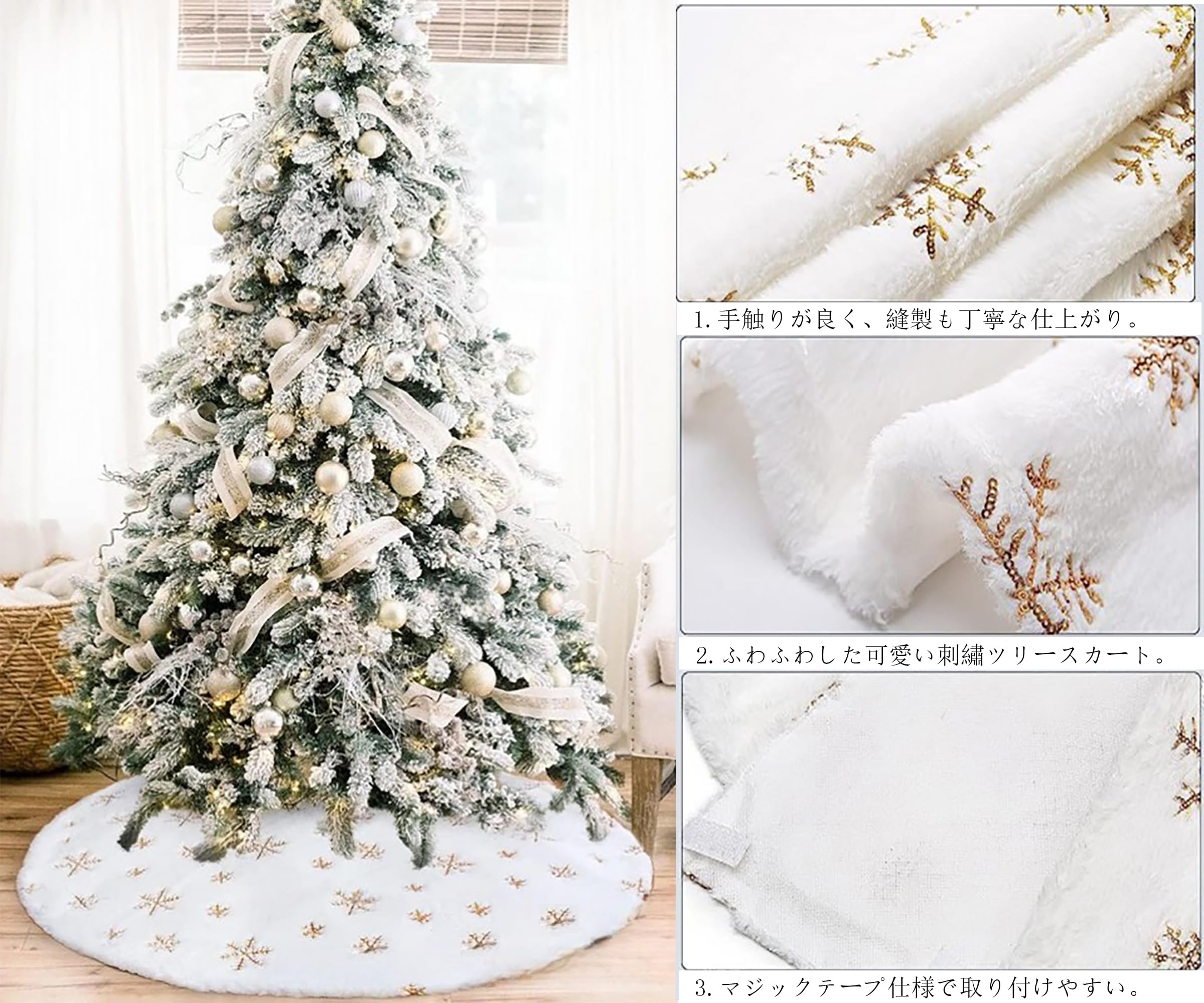 柔らかくてふわふわしたデザインでクリスマスツリー スカートをクリスマスツリーの足元に置くと、豪華感もクリスマスの雰囲気も盛り上がります。ご自宅、庭、学校、バー、 壁、ドア、オフィス、屋外、お店、ホテル、デーパート、店舗などでクリスマスツリーをもっと美しく、華やかに飾ることができます。