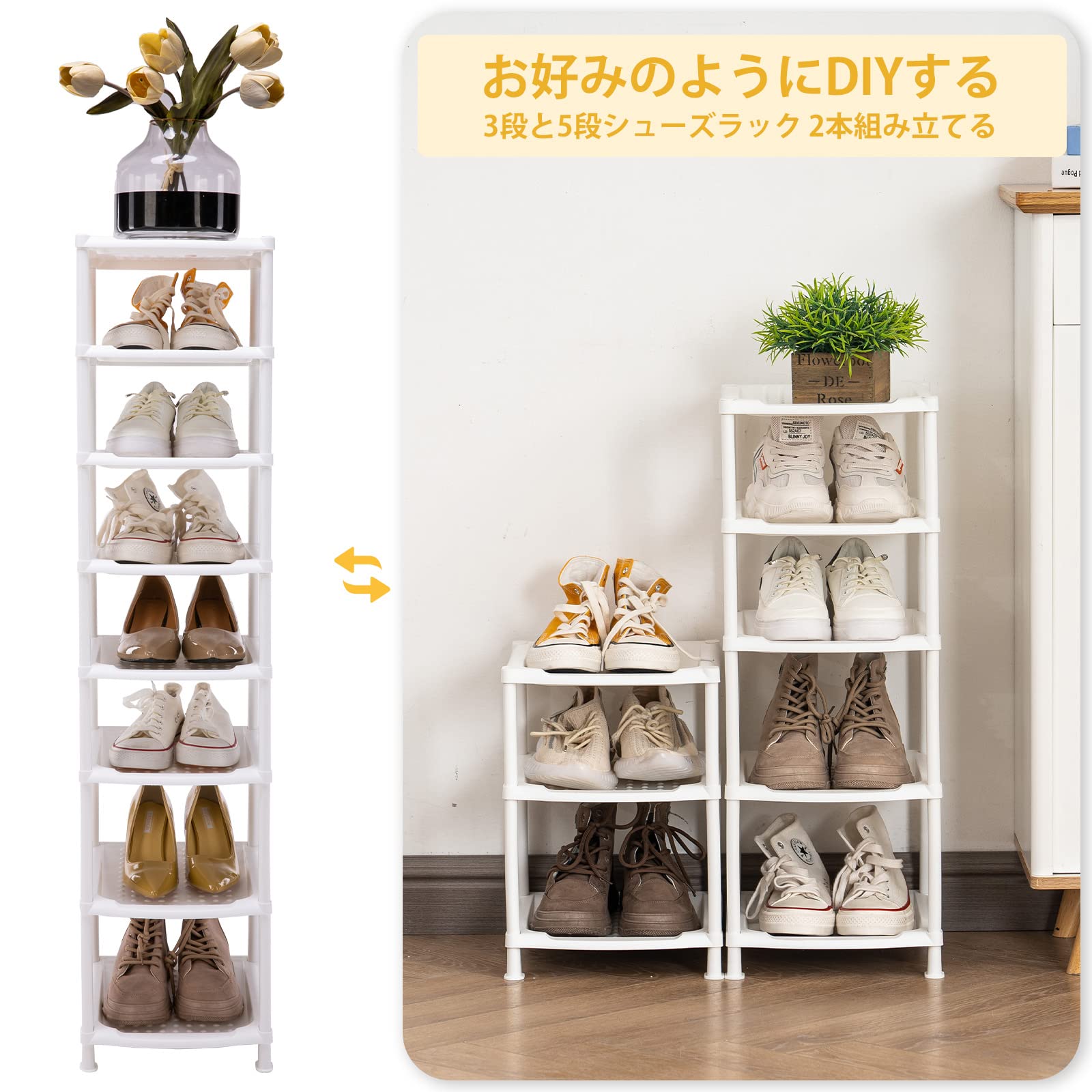 【組み立て簡単・アレンジ自由】シューズスタンドは工具も要らず組み立ては支柱を差し込むだけで約10分かかります。「長いパイプを低い段で設置してください」お好みのように棚の数を自由に調整し、2つの靴収納ラックに分けて異なる部屋に配置するできます。お勧め:棚の数が多い場合、下から上まで重い靴を置いたら安定性がよりよいです。