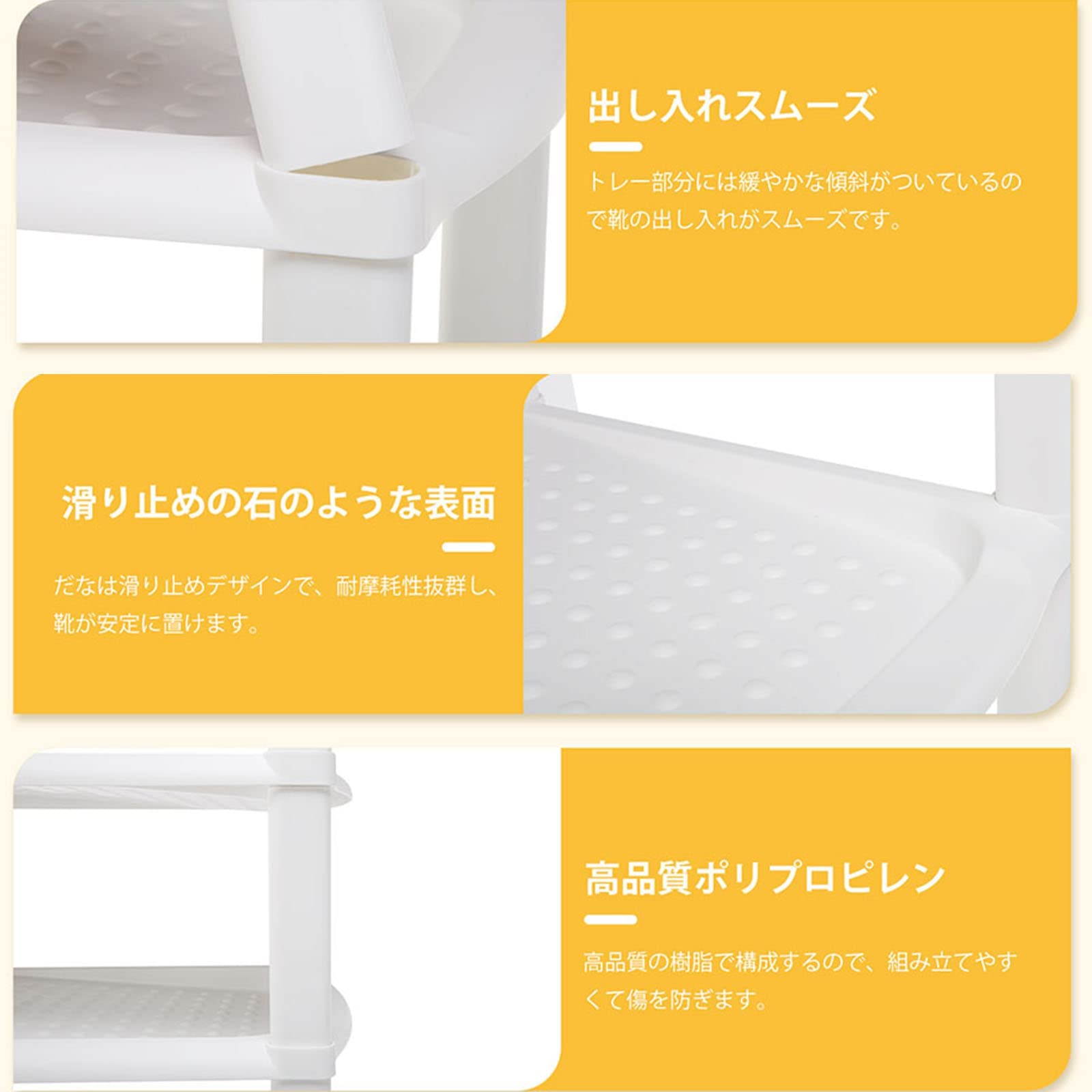 【斜め・滑り止めデザイン】傾斜のついたトレーで、がちなすぐ履きたい靴入れたり取ったります。靴箱と下駄箱よりも通気性が良いです。シューの脱落を防ぐ棚の表面は滑り止めの石のようなデザインです。たなは14cmと18cmの2つの間隔タイプ、ハイカットシューズ、レザーシューズ、スポーツシューズなどの色んな靴を完璧に収納できます。