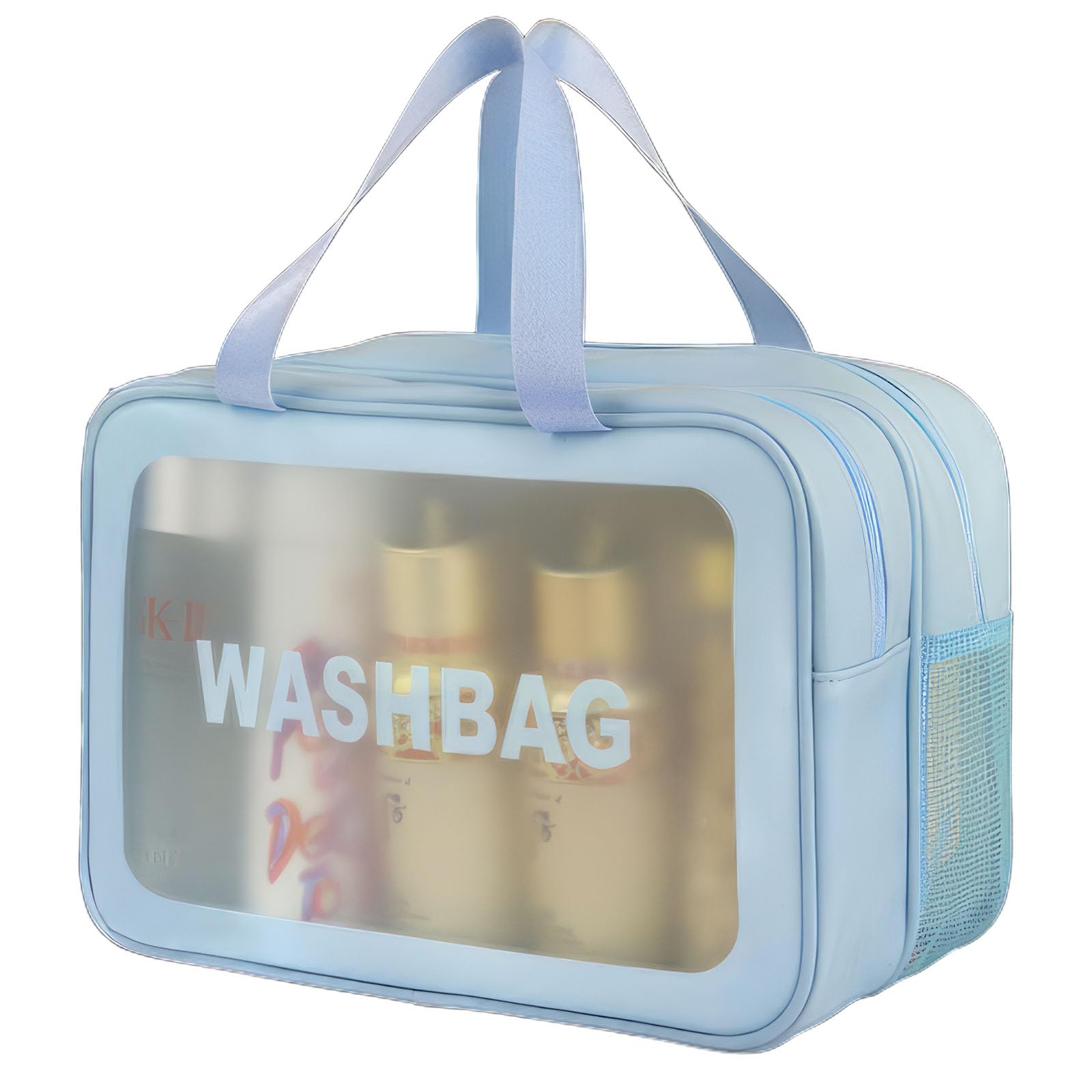 【在庫処分】化粧洗面バッグ 2段収納バッグ PVC 収納袋 メイクポーチ メイクバッグ コスメ収納 スキンケア用品収納 仕切り付き 乾湿分離 大容量 防水 水泳 フィットネス 入浴 旅行 出張 多機能 (Blue-ブルー-L) | GIGATERA