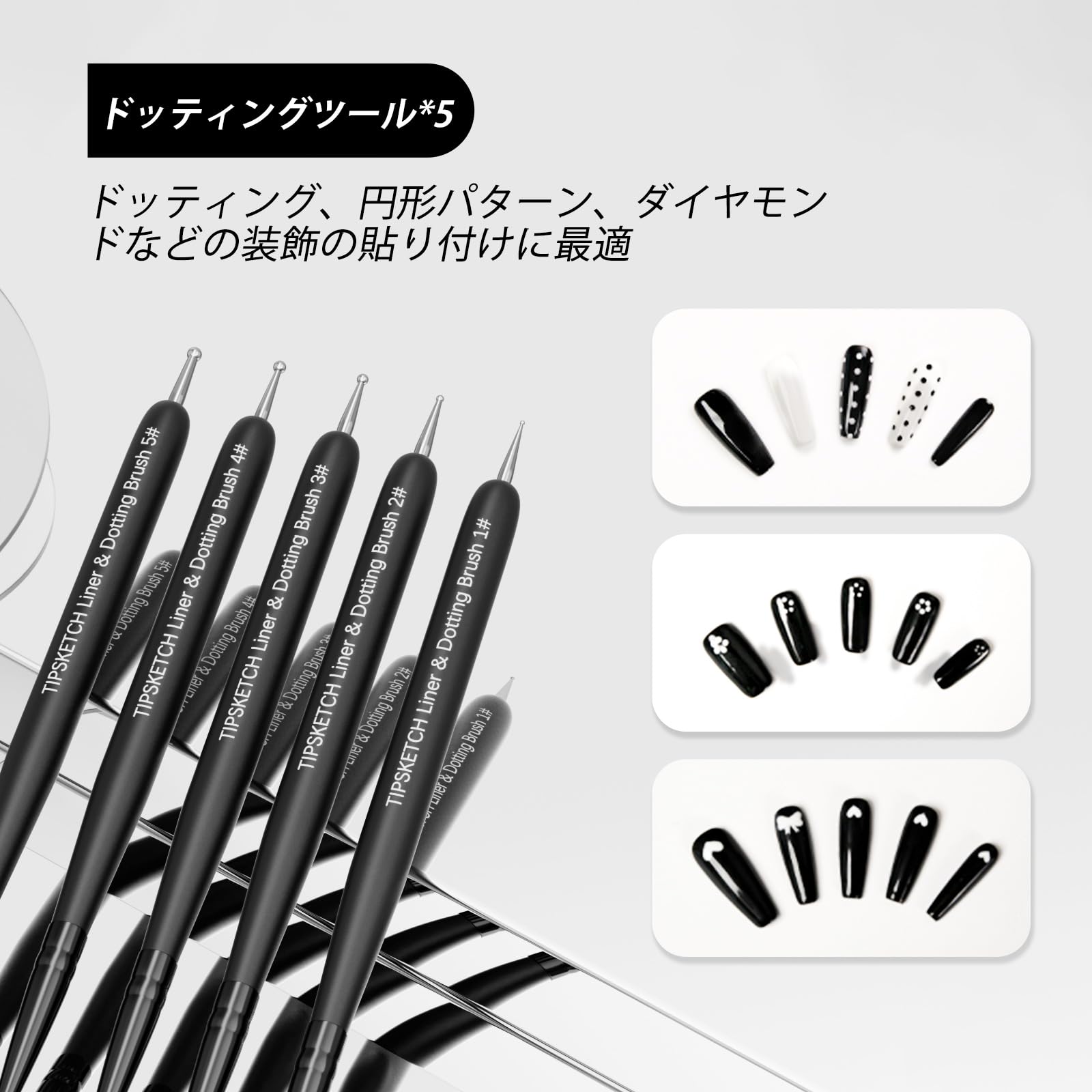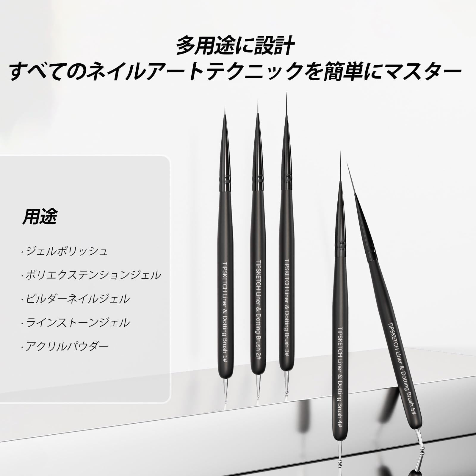 【多用途ネイルブラシセット】この5本セットには、極細ライナーブラシとドットツールがそれぞれ含まれており、細かいラインから点描まで、多様なデザインに対応できます。各ペンの前端は極細ライナーブラシ、尾端はドットツールで構成されており、異なるサイズで幅広い用途に対応します。ライナーブラシはネイル向けに選ばれた専門の日本製ナイロン繊維を使用しています。