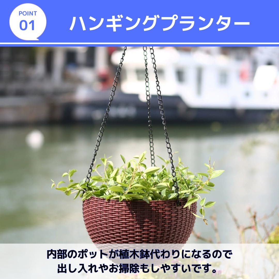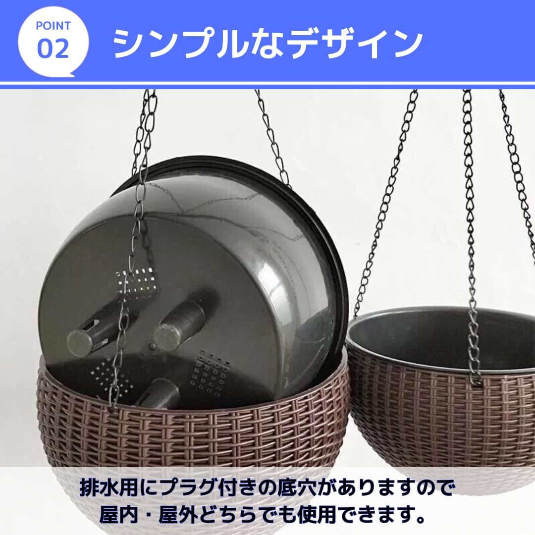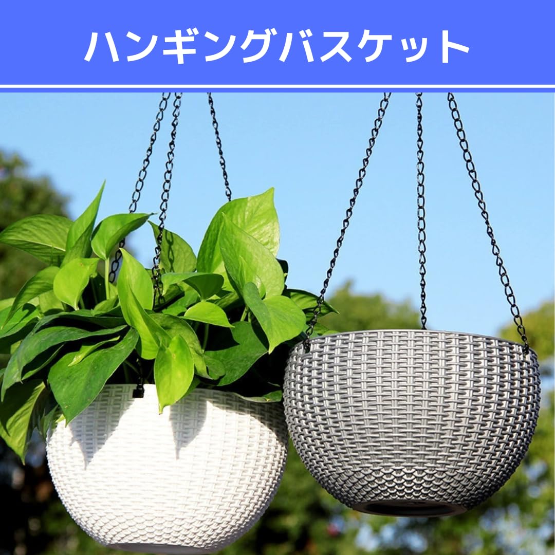 【ハンギングプランター】鉢ごと植物をプランターに置いても、ずれにくく、安定感があります。また、直接土を入れる場合にも、内部のポットが植木鉢代わりになるので、出し入れや、お掃除もしやすいです。 【シンプルなデザイン】排水用にプラグ付きの底穴がありますので、屋内・屋外どちらでも使用できます。シンプルなデザインでインテリア性が高く、お家の中や玄関先でも素敵にお花や観葉植物を楽しめます。 【簡単お手入れ】底穴の排水プラグにより、屋内外どちらでも使用可能なプランター。樹脂製で軽くて丈夫、丸洗いも可能で、お手入れが簡単です。吊り下げも平置きも可能で、どんなスペースでもお使いいただけます。