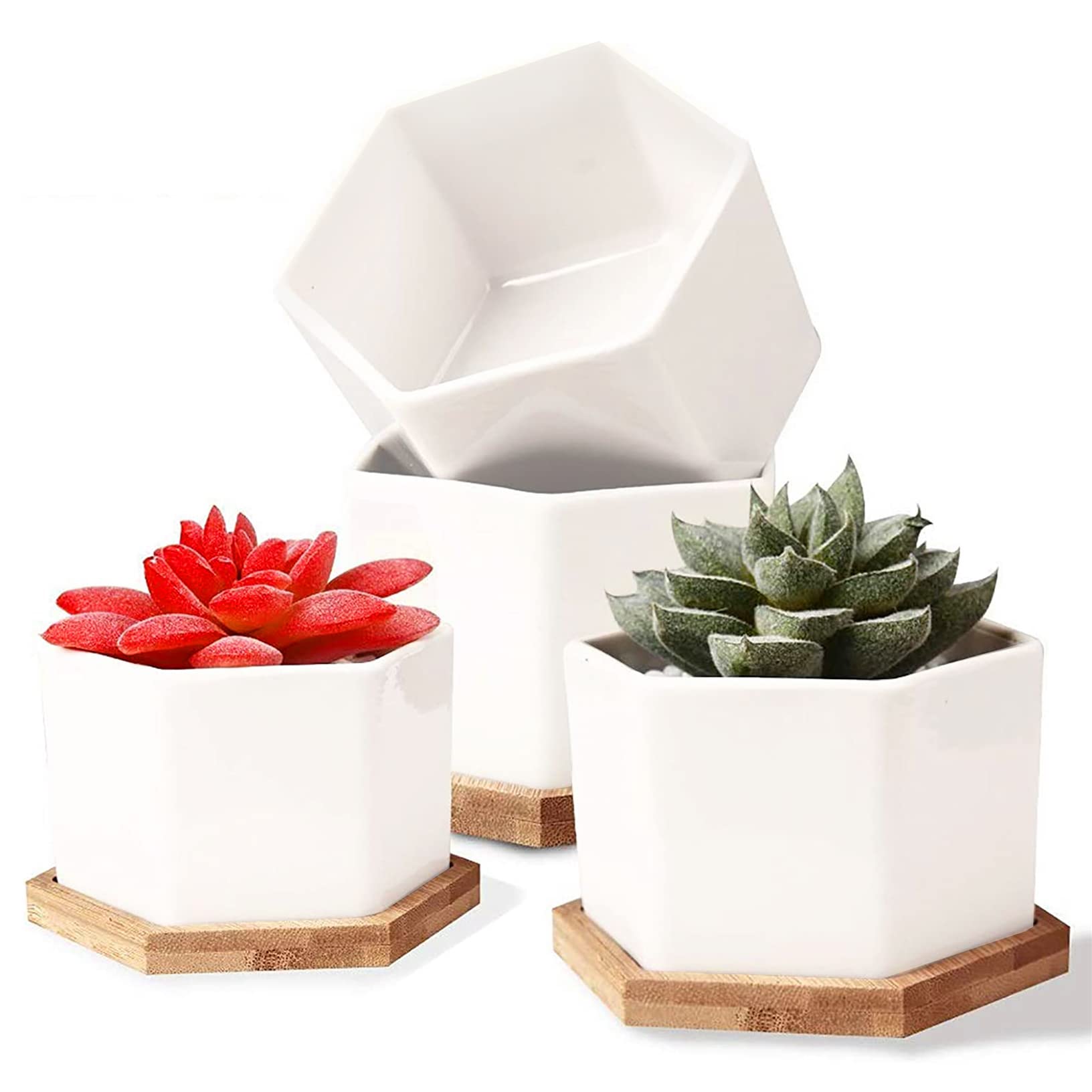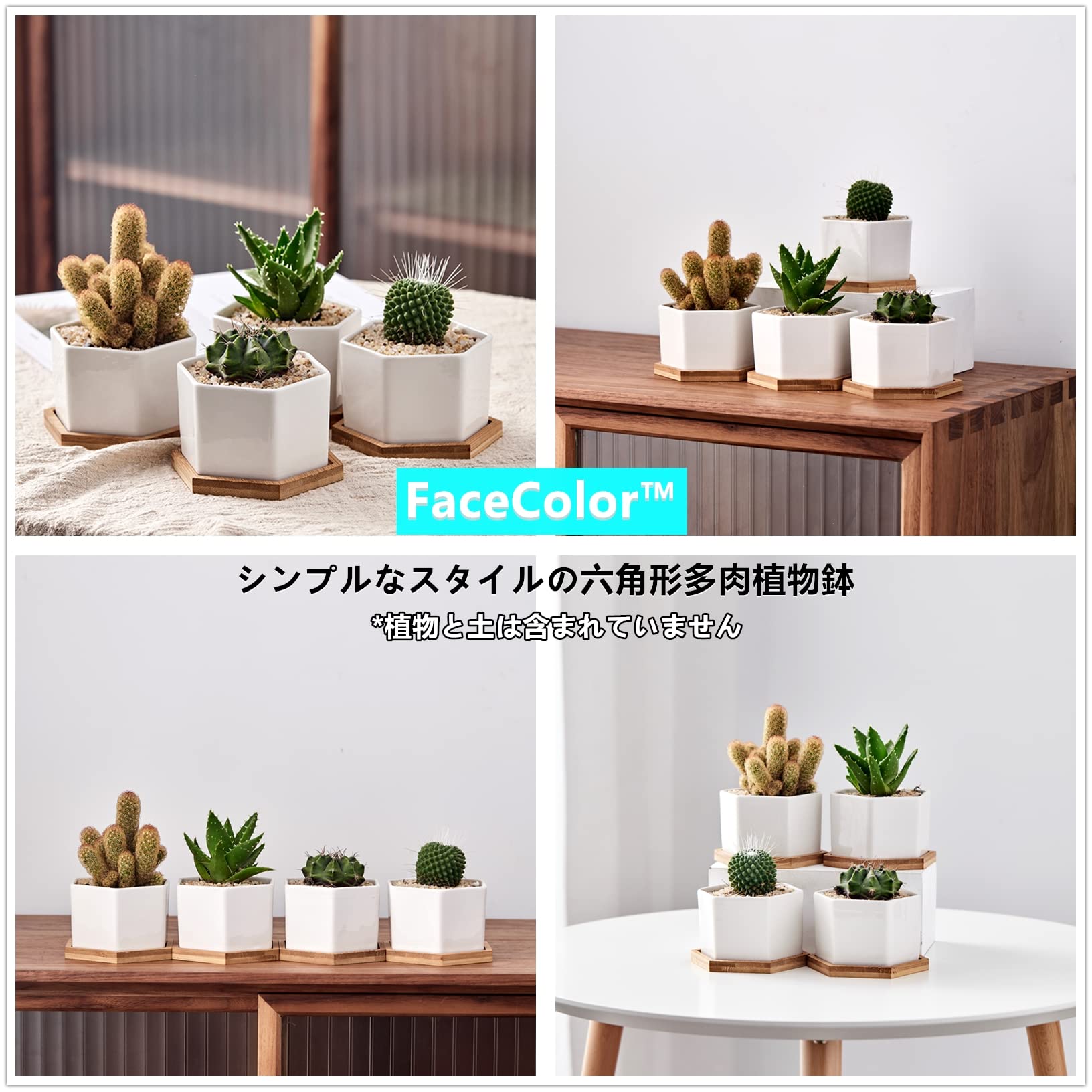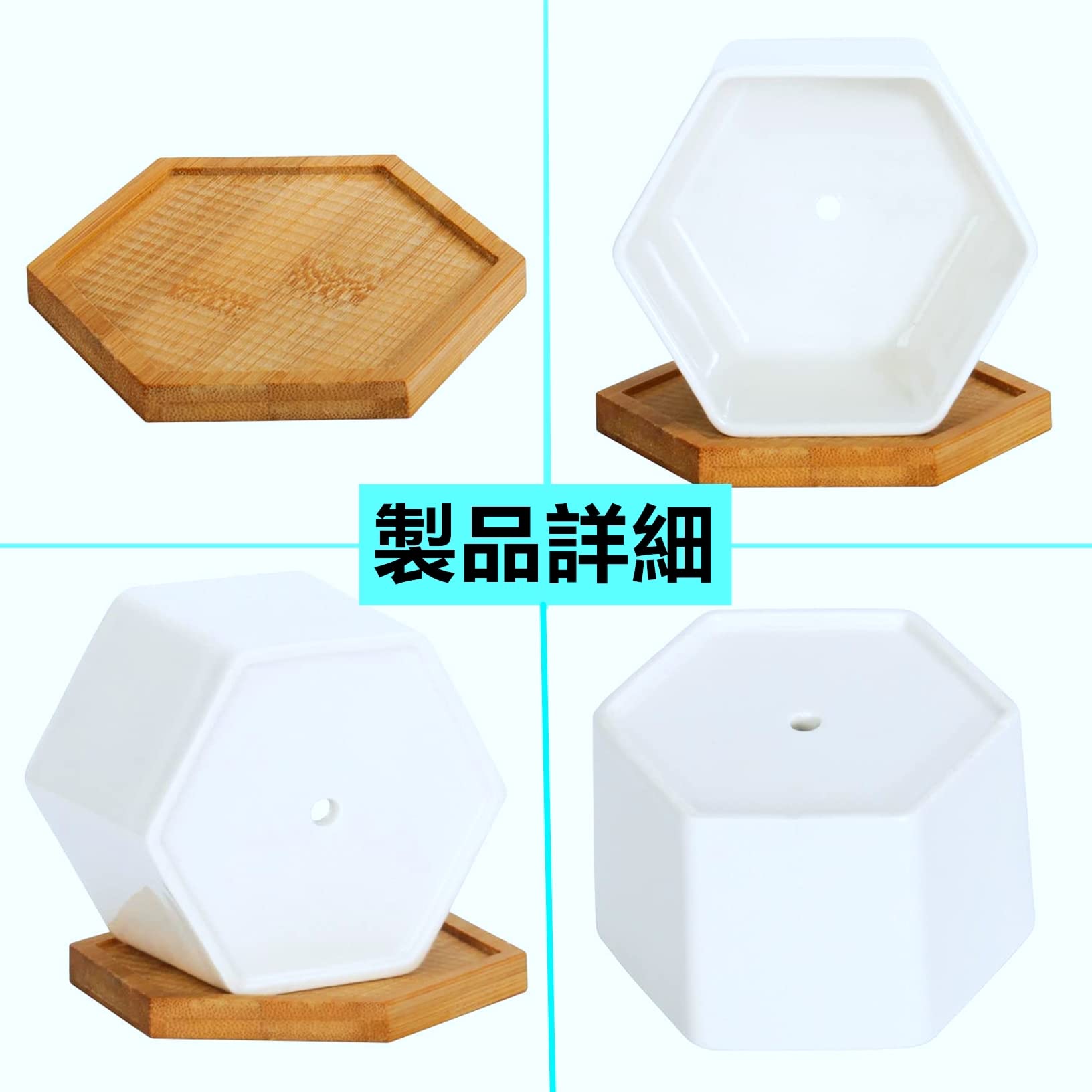 多肉植物鉢 陶器鉢 プランター サボテン鉢 六角形 (サイズ 9*10*6 CM) 底穴あり トレイ付き ヘキサゴン ホワイトセラミック 観葉植物 ガーデニング リビング 玄関 バルコニー 庭インテイア適用 4点セット (植物を含まない)