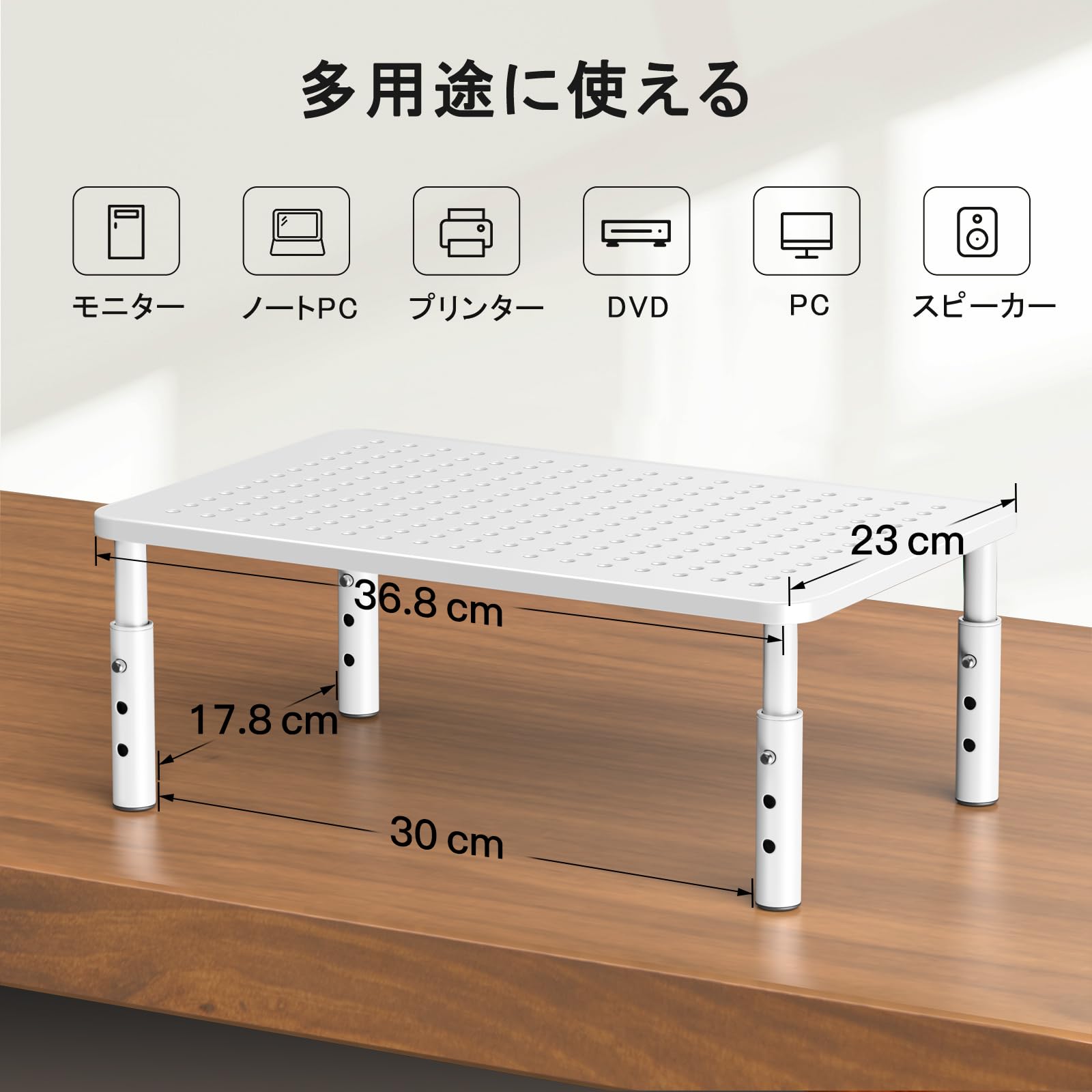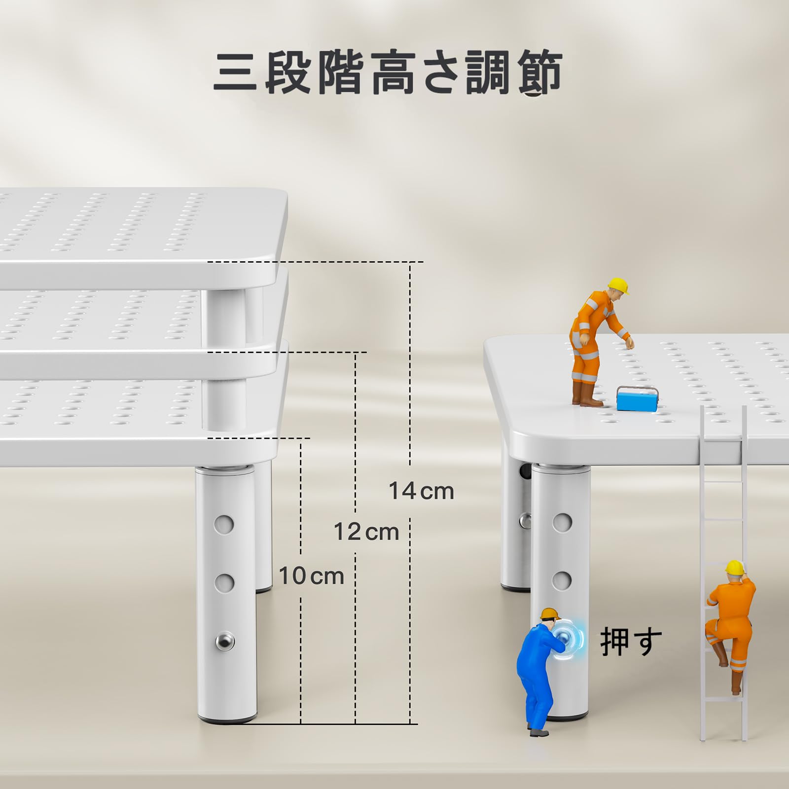【製品仕様】幅:36.83cm 奥行き:23.1cm 高さ:10-12-14cm三段階高さ調整可能 天板下 幅:30.4cm 奥行き:17.7cm 材質:スチール、最大耐荷重:20kg