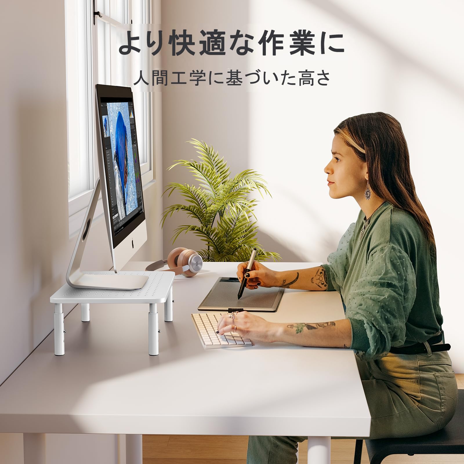 【猫背対策】机上台にモニターを設置することで、目線の位置を上げモニターを見やすくします。目の疲れや背中および頚椎の疲労を軽減でき、作業効率も上がります。モニター台のほか、ノートパソコンや電話台・FAX台など様々な機器を設置できます。