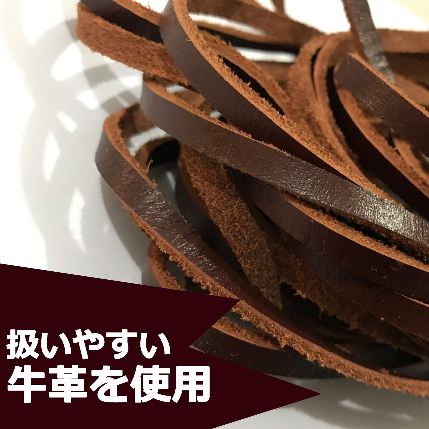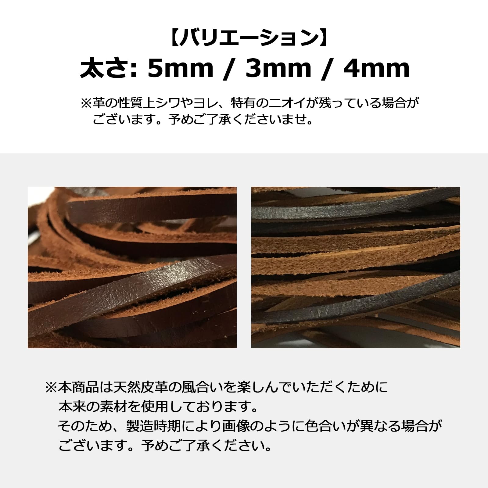 上品なダークブラウン色の革紐 平紐は、幅3mm、4mm、5mmの3種類から選択可能です。牛革を使用したしなやかな素材で、ストラップやキーホルダー、レザークラフトなどの手芸作品に最適です。厚さ2mmでハサミでも簡単にカットでき、ひび割れしにくく扱いやすいのが特徴です。