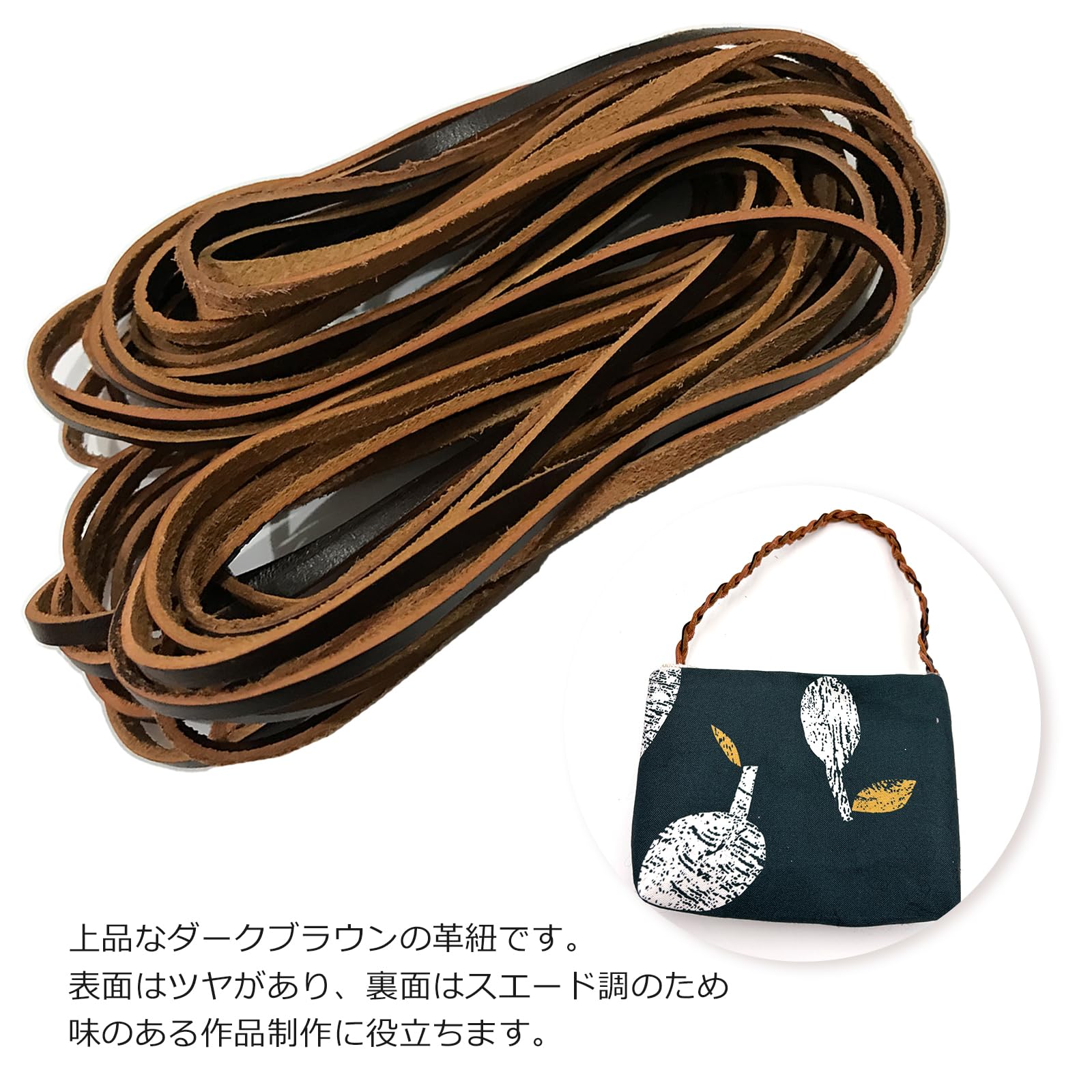 シンプルながら高級感漂うダークブラウンの革紐 平紐は、作品の完成度をワンランク引き上げます。編み込みや装飾に、またレザーアイテムの補修にも適した、多用途に活躍する革素材です。