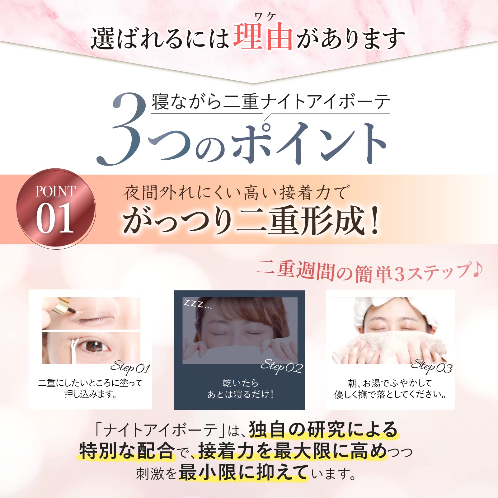 【高い接着力】ナイトアイボーテは接着成分の独自研究により、特別な配合で接着力を最大限に高め、刺激を最小限に抑えました。