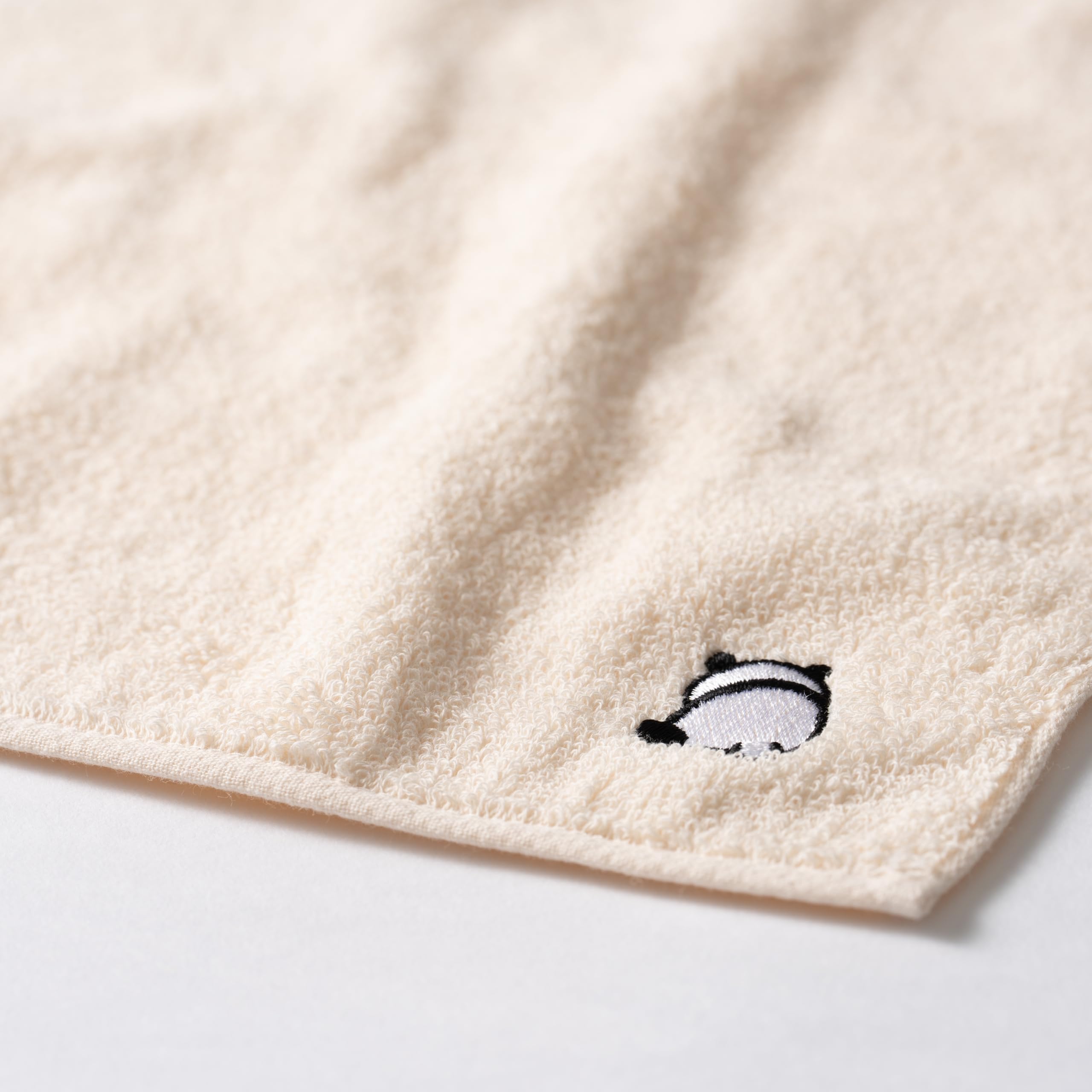【今治タオル kainoo たまごぱんだ ハンカチタオル】 とってもかわいいぱんだの刺繍がアクセントのハンカチタオルです。たまごいろのふわふわやさしい肌触りが使うたびに癒してくれます。