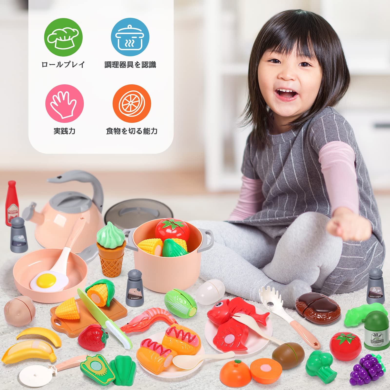 【超豪華な44点おままごとセット】このおままごとセットには野菜、果物、魚、エビ、洋食、調味料、キッチン用具など44点があります。お子様がお料理をしているように、リアルなデザインで作られています。