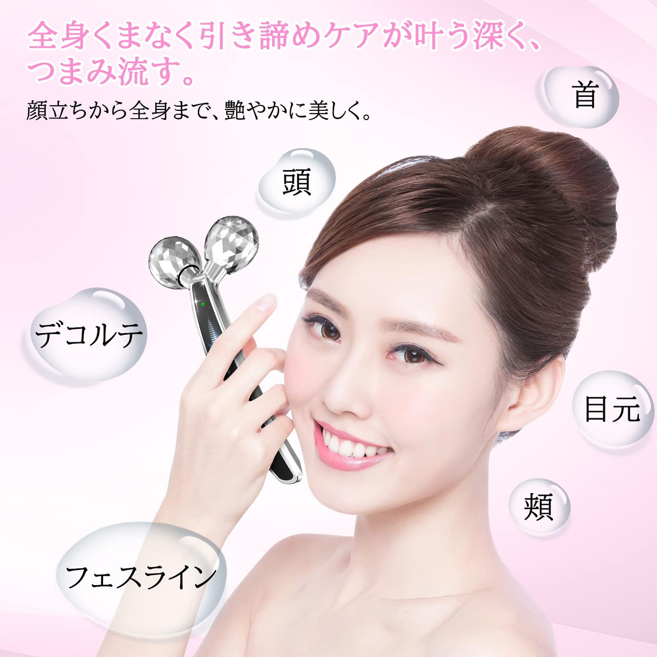 ??【多機能な美顔器・美容器】顔も身体も一緒にケアしたい方へオススメです。顔のハリ低下、むくみの原因は老廃物の蓄積によって起こります。身体のめぐりをイメージしながら、美顔ローラーでロコロコするだけ。肌の曲線に合わせてスムーズに密着して動くので、お悩みの部位をつまんで、揉んで、不要なお肉をマッサージしてくれます。小顔を実現するだけでなく、気になるボディのお肉もつまみあげ、スレンダーな首と引き締まった腕とウエストを実現できます。