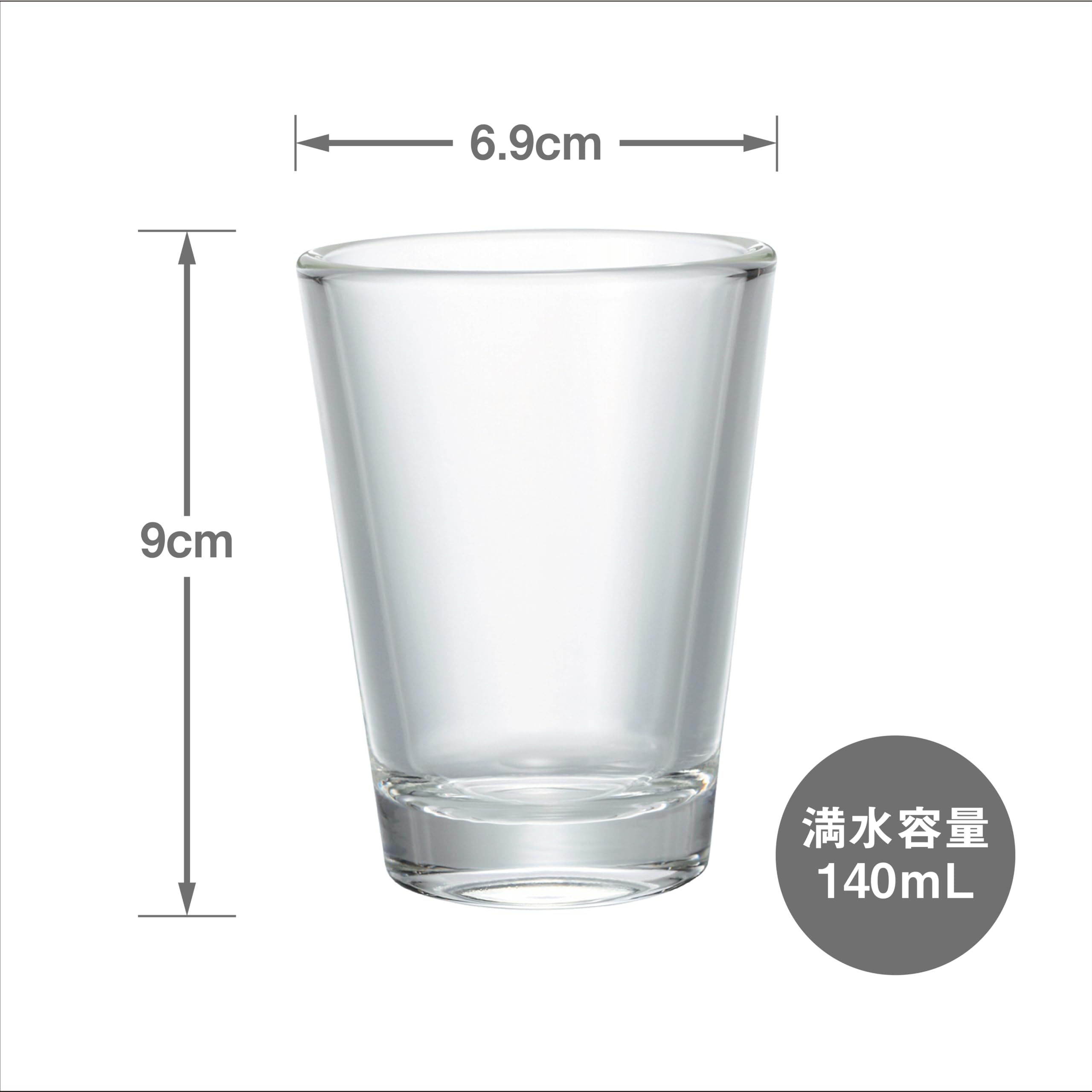 【商品詳細】 本体サイズ:幅6.9×奥行6.9×高さ9.0cm、口径6.9cm、満水容量:140mL、本体材質:耐熱ガラス、日本製