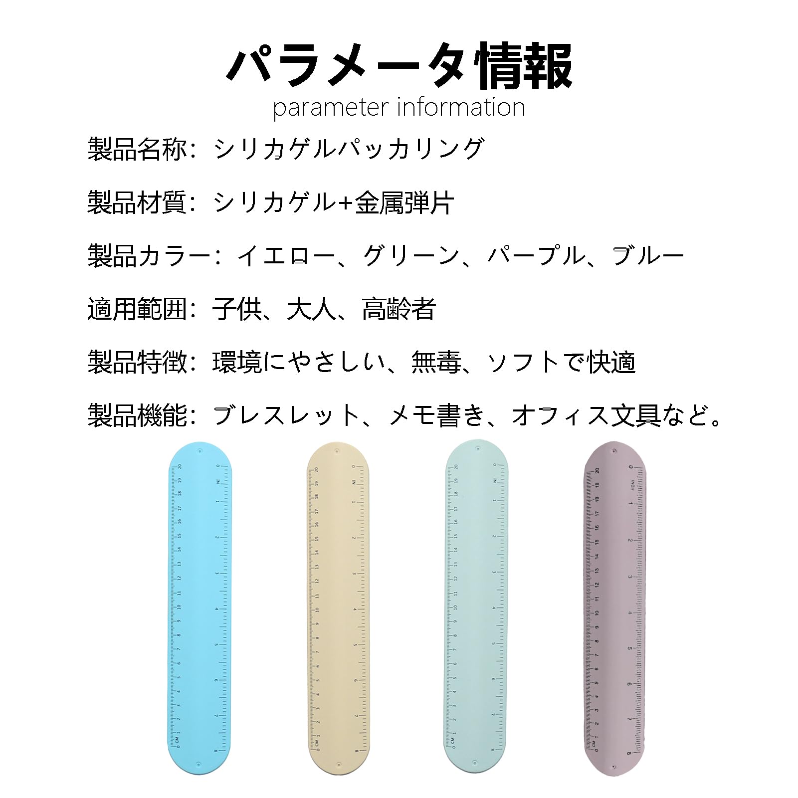 【製品の内容】手首メモ x 4,サイズ:23.8*4.5cm,カラー:ブルー、グリーン、イエロー、パープル。収納袋x 1。