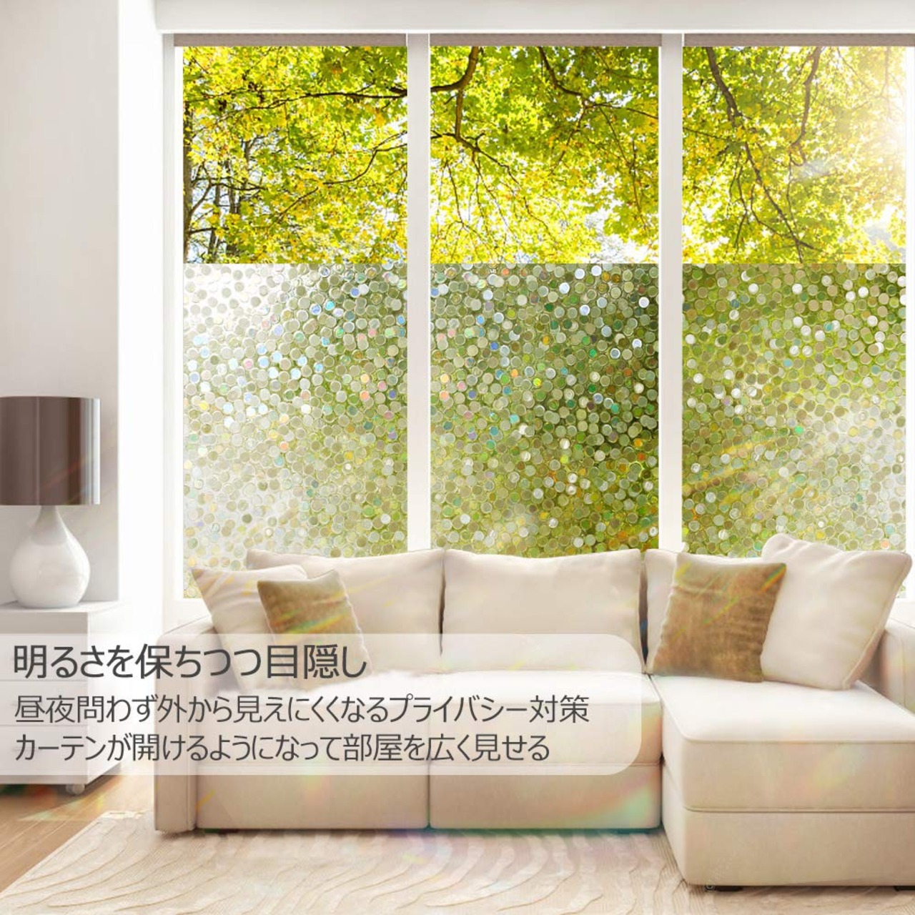 目隠し・日射調整・UVカット:明るさを保ちつつ、カーテンとさらば!20cm以上離れていれば、室内が見えにくく!天気や昼夜を問わず、いい目隠し効果があります。また、UVA 84%・UVB99% 以上カットし、日光を和らげ、内装を保護します。