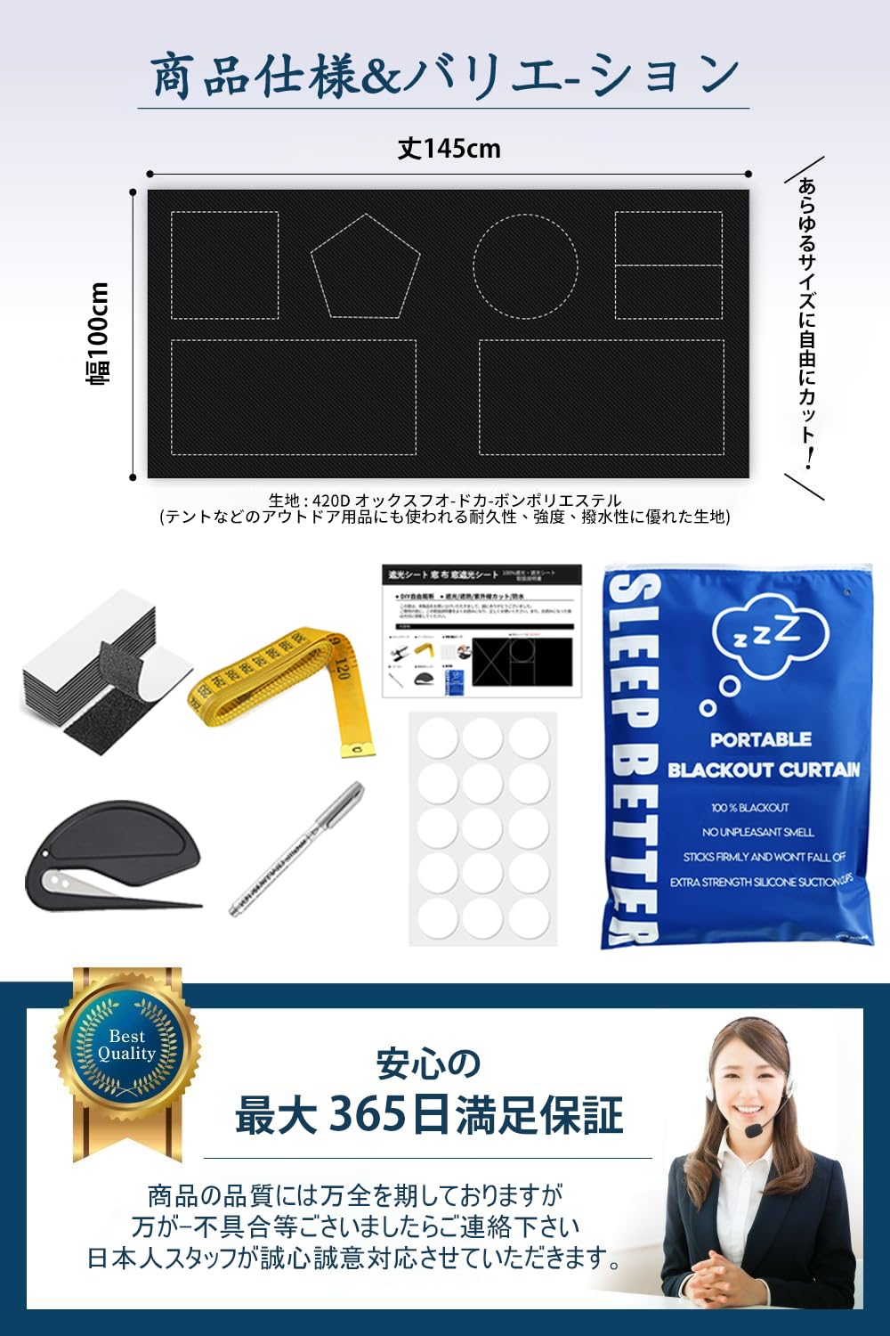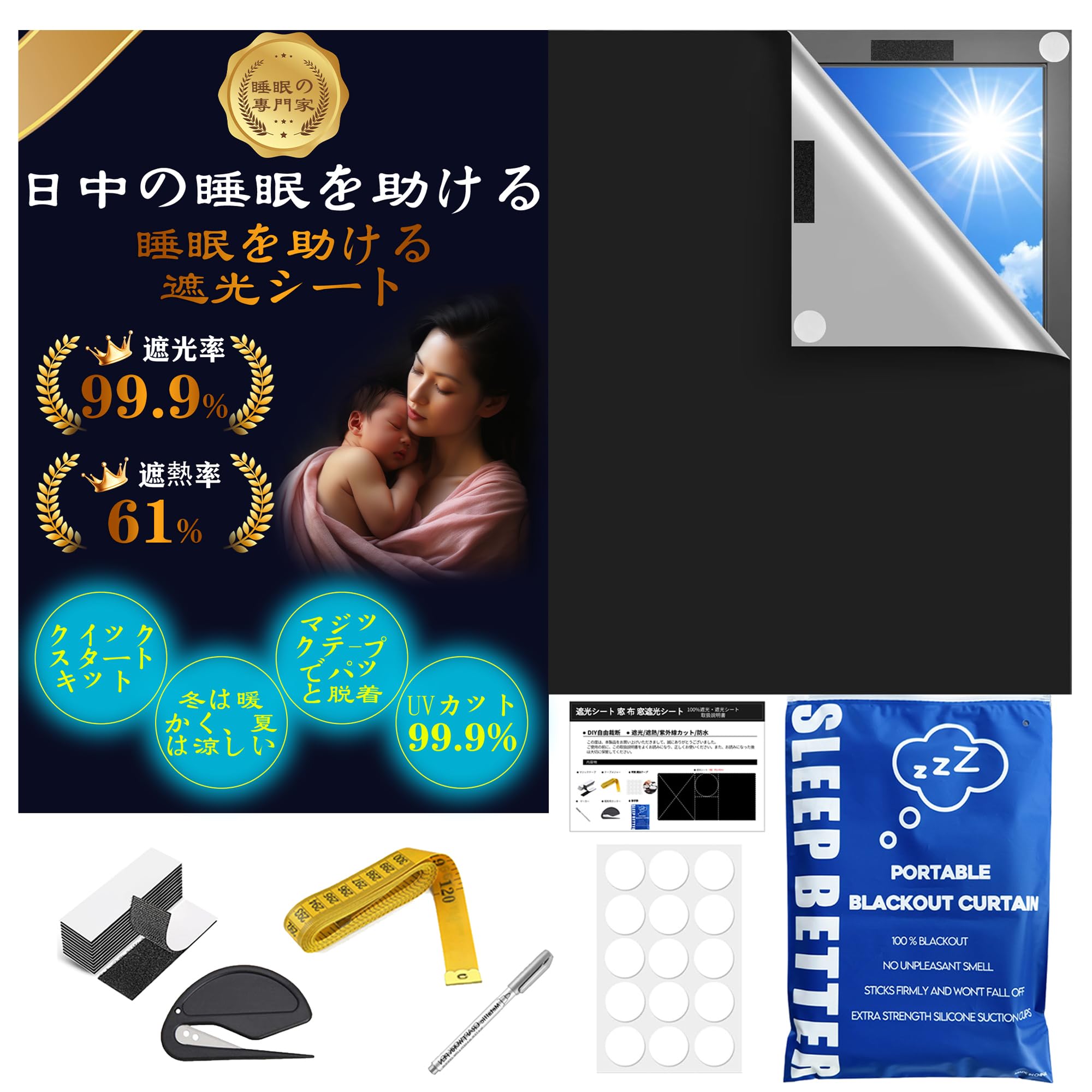 ◆【携帯用遮光カーテンには、完全キットを含む&】 遮光シート×1枚、丸透明両面テープ×2枚(計30PCS)、マジックテープ(3×10cm)×20セット、マーカーペン×1本、シート裁断用カッター×1個、テープメジャー×1巻、収納袋×1個。