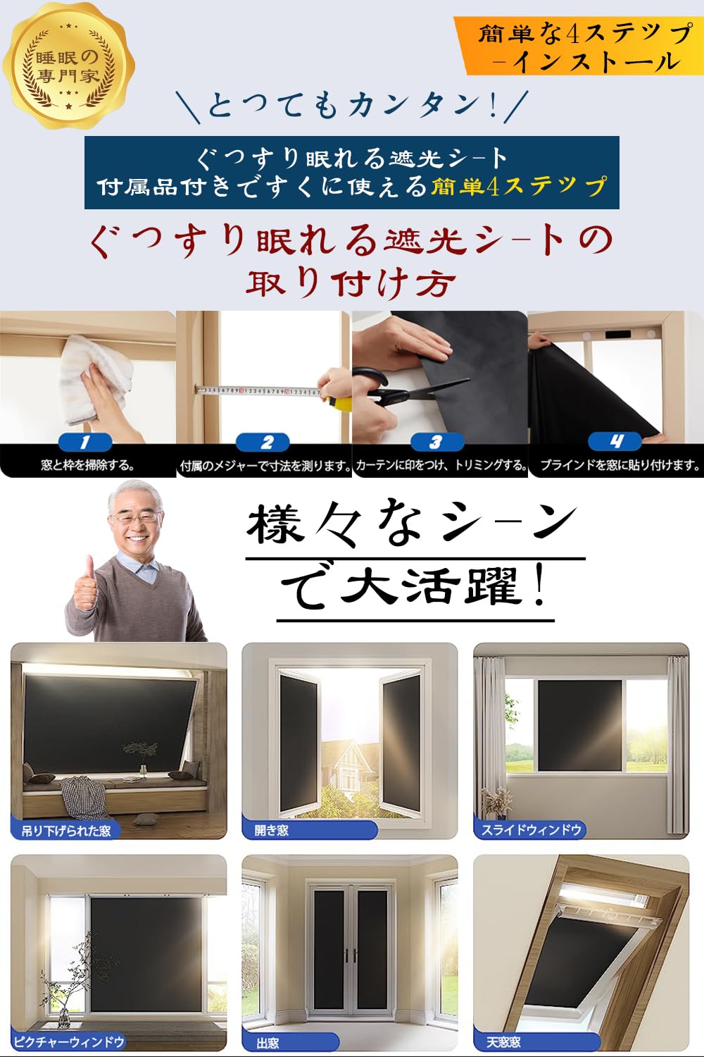 ◆【遮光率100%・真っ黒・目隠し効果】迷ったらこれ!シンプル&機能性重視の方におすすめです。①窓遮光シート 420Dオックスフォード カーボンポリエステル 遮熱シルバーコーティング加工済、遮光率100%、日差しの強い窓でもしっかりと遮光できるので、光をできる限りシャットアウトしたい方におすすめです、睡眠の質向上にも役立ちます。。②目隠し効果も抜群で、窓に貼るだけでお宅の大切なプライバシーをきちんと守ってくれます。③無カーテン化で部屋がすっきりして広くになります。