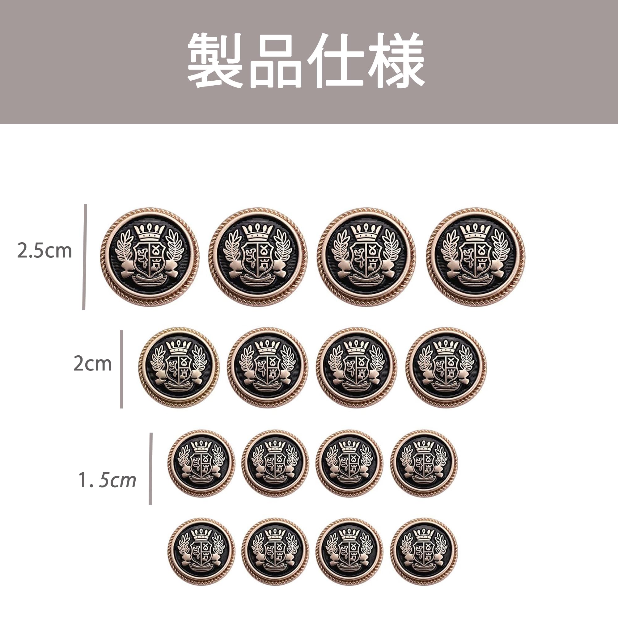 【製品仕様】本セットには16個の異なるサイズのスーツジャケット用ボタンが含まれており 具体的には8個の15mmボタン 4個の20mmボタン 4個の25mmボタンです クラウンパターンのデザインはファッション性と美しさを兼ね備え 豪華な印象を与えます