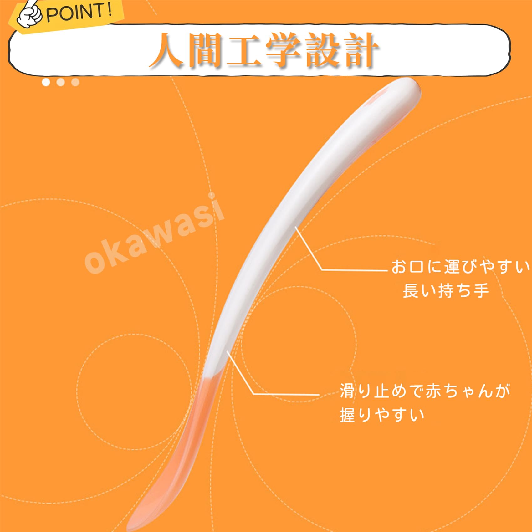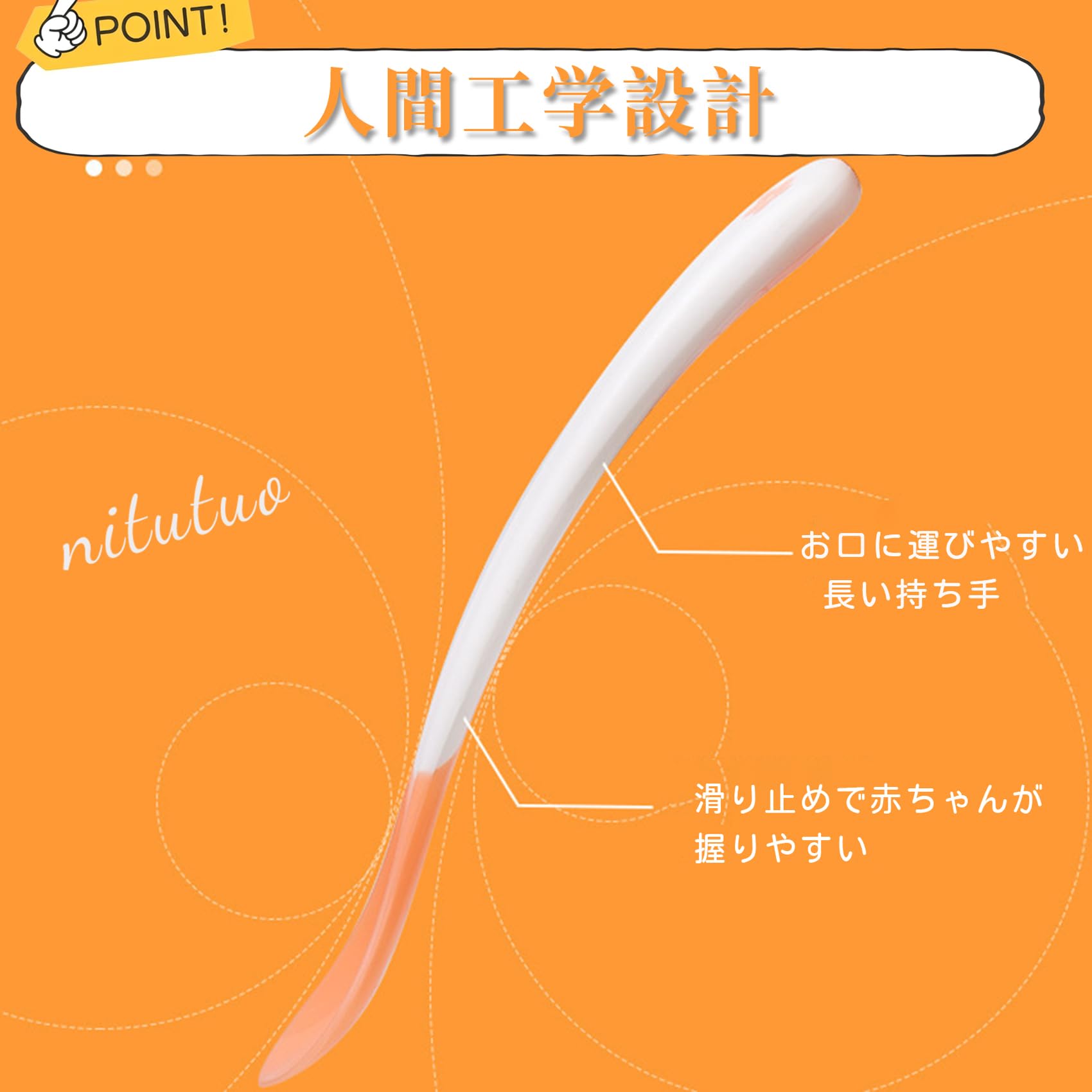 【曲げられる設計】カーブのついた持ち手は持ちやすく、食べさせやすい角度がついています。滑らかなデザインで水や食べ物が閉じ込められるのを防ぎ、私たちのスプーンで簡単に固体を始められます。