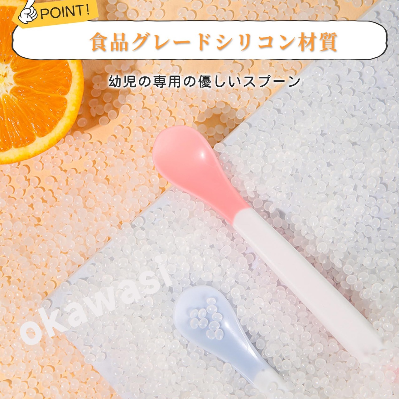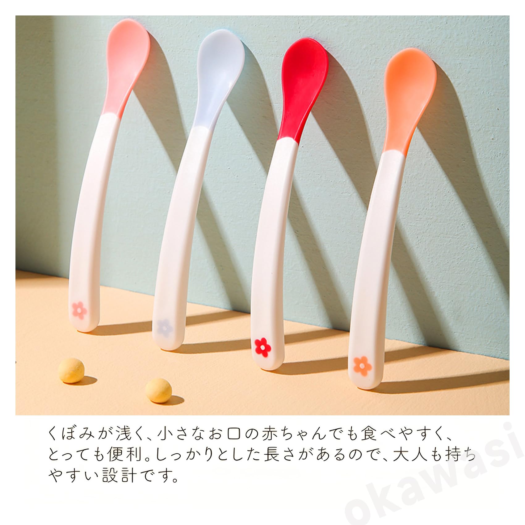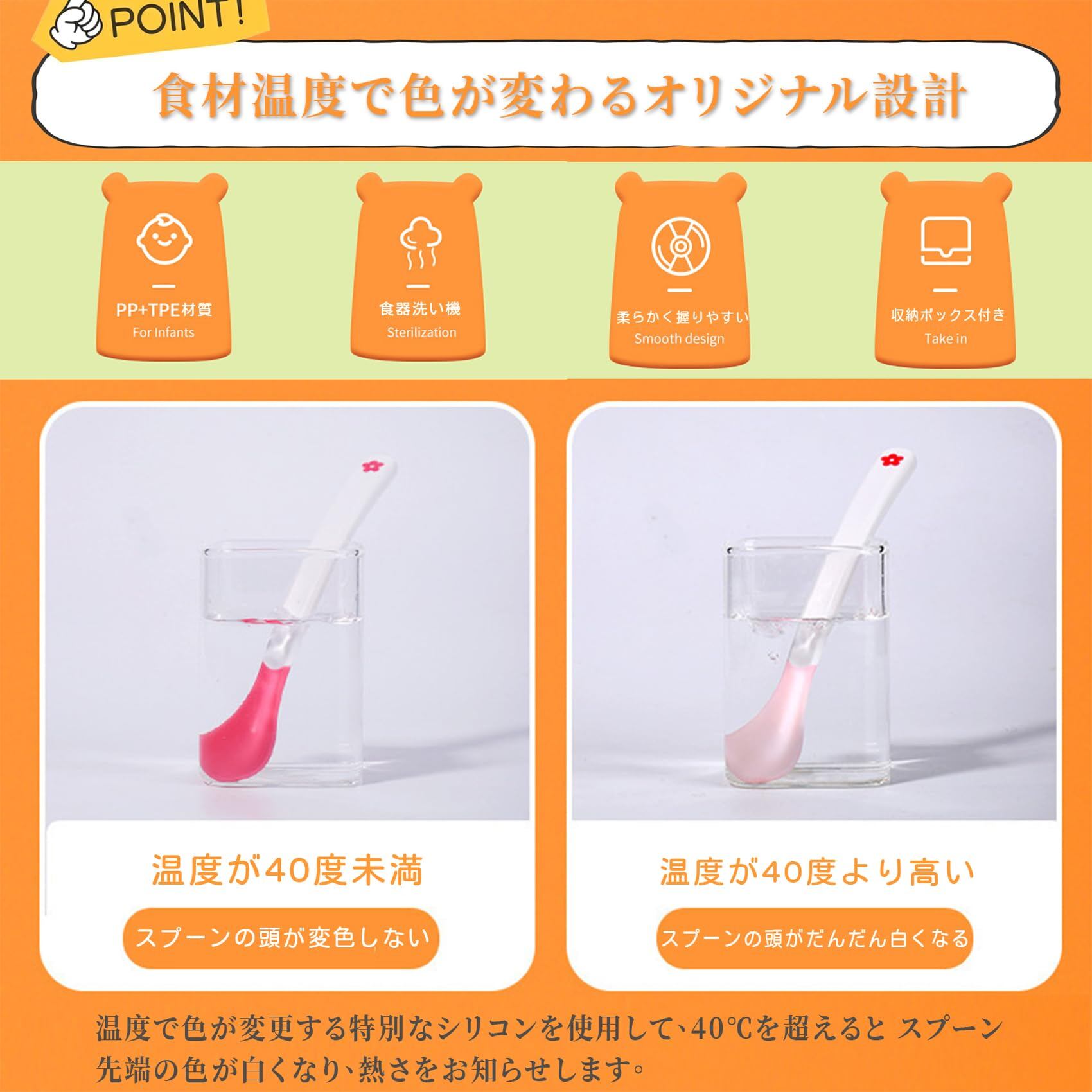 【離乳食スプーン】温度で色が変更する特別なシリコンを使用して、40度を超えると白色が変わります。軽くて滑り止めハンドルの特別なデザインで、赤ちゃんがグリップするのに快適で便利です。