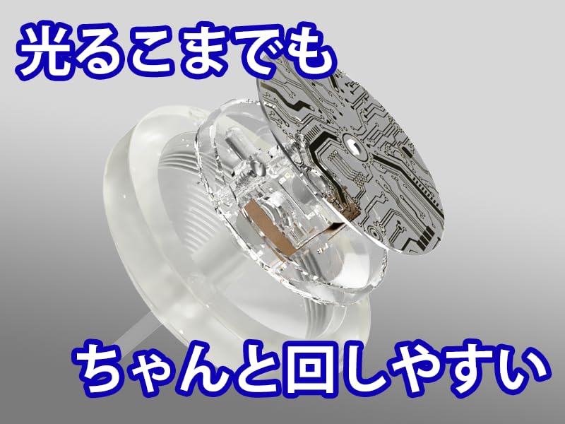 初めてのお子様でも回しやすいコマ世界大会認定こま ヒバリに光る回路を追加。地面でのこま回しがメインの遊び方になります。ある程度強く回転をかけるとLED回路が色鮮やかに光ります。