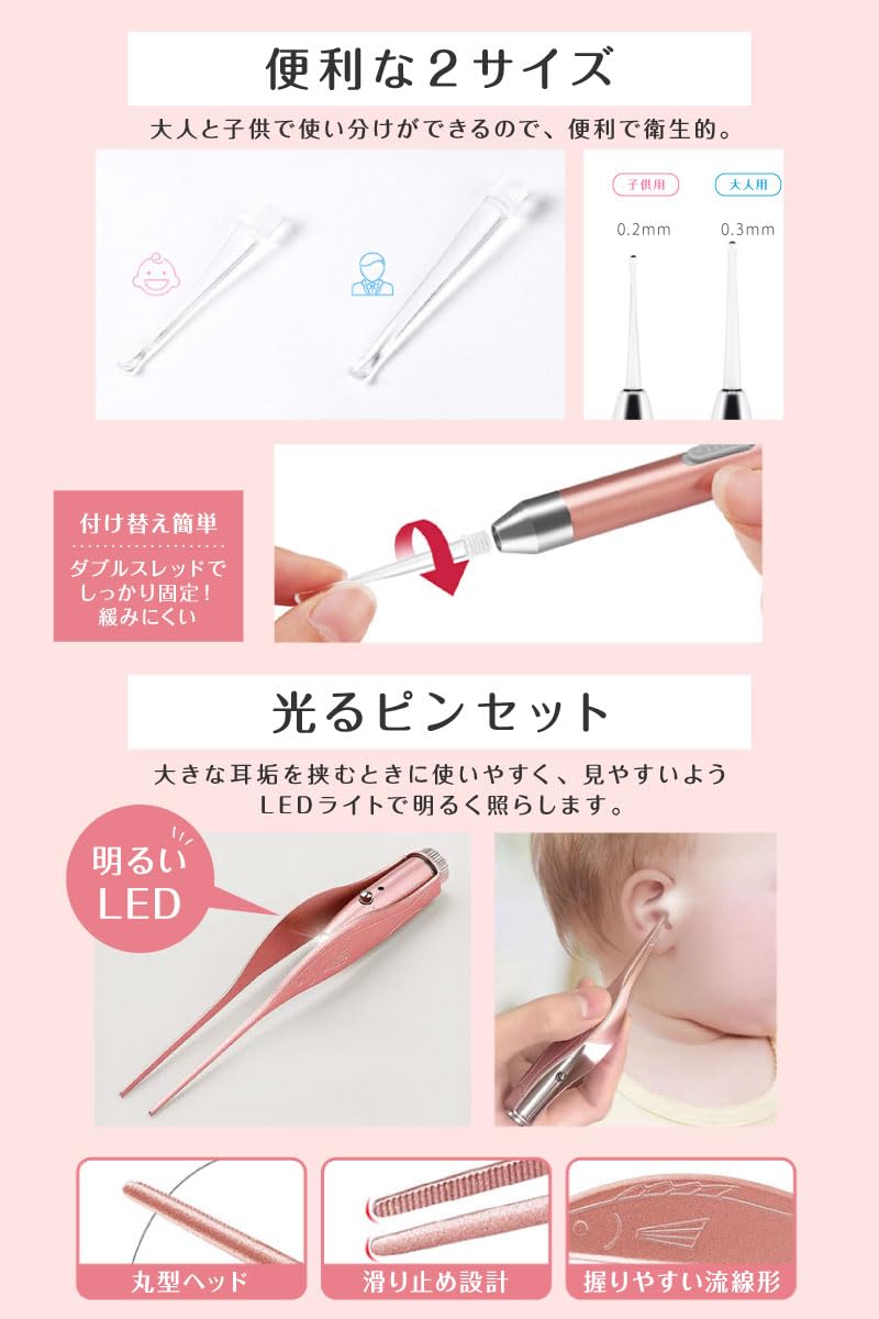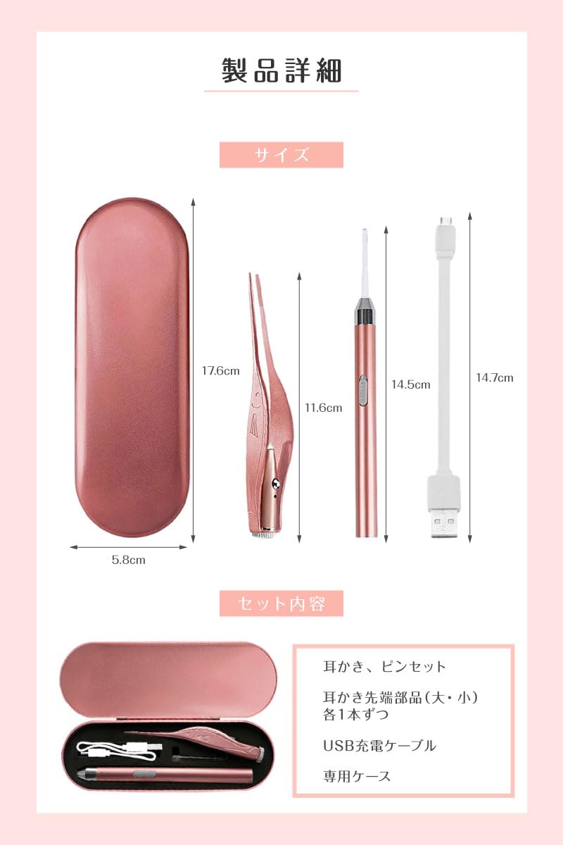 LEDライトで光る 耳かき ライト LED USB 充電式 4点セット 光る耳かき ピンセット 耳掃除 照明付き こども 子供 子ども 耳掃除 便利グッズ 子育て (ピンク)
