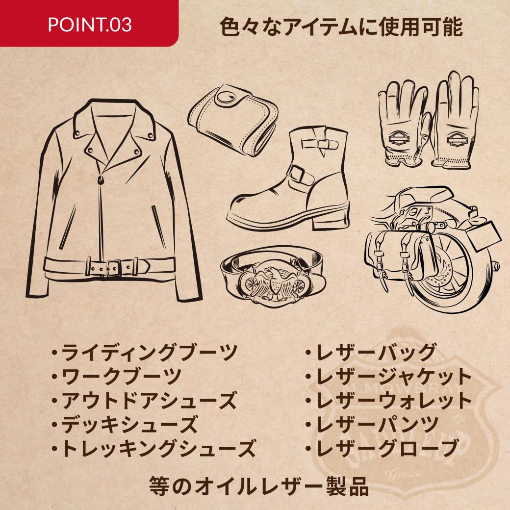 使用できるレザーアイテム:ライディングブーツ、ワークブーツ、アウトドアシューズ、デッキシューズ、トレッキングシューズ、レザージャケット、グローブ、バッグ、ウォレット、ベルトなどのスムースレザーアイテム