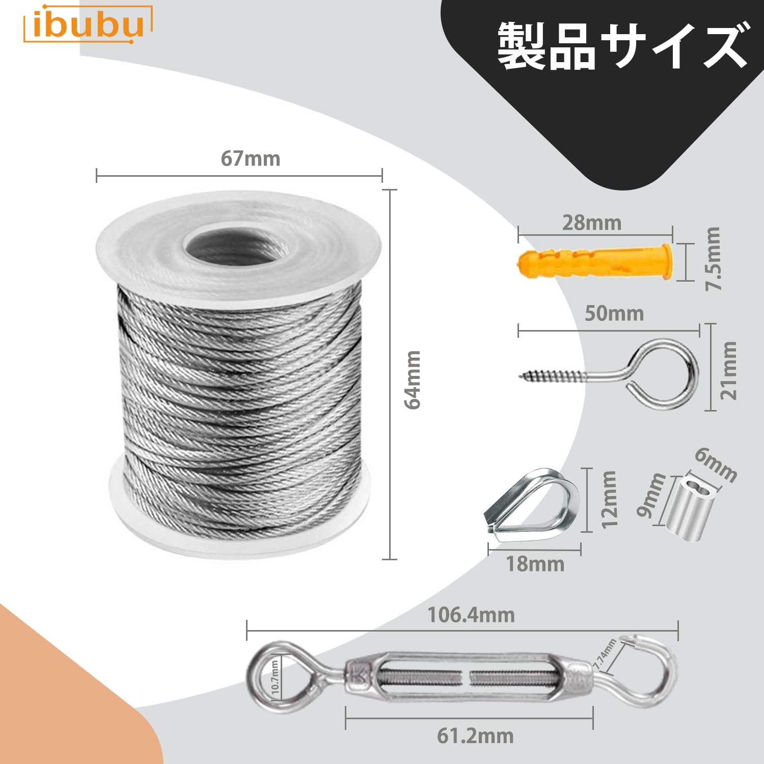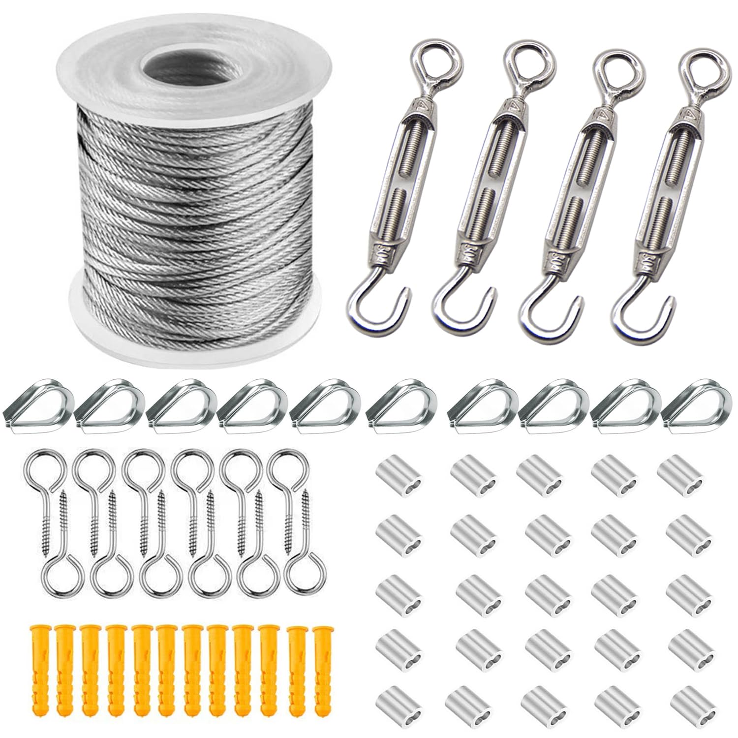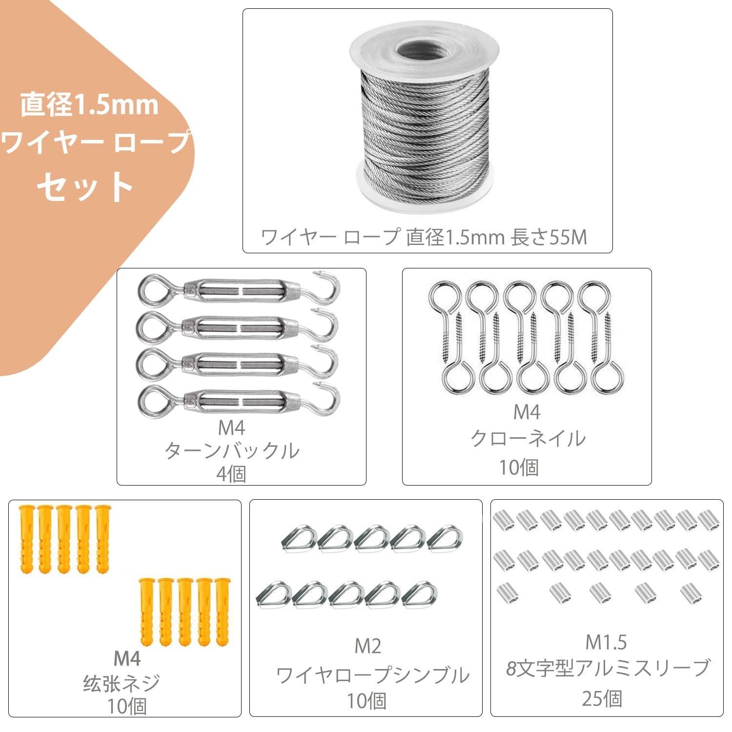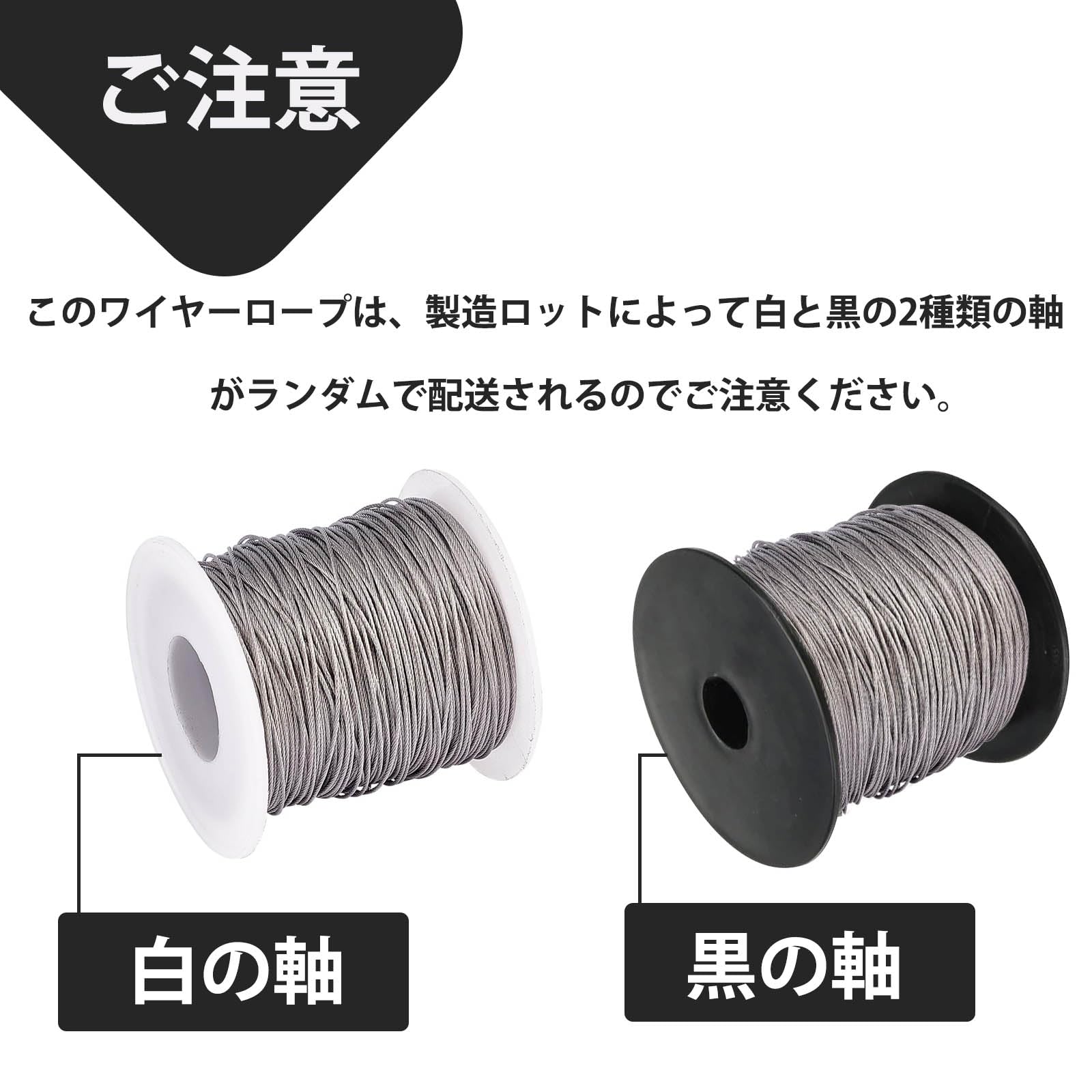 【バスケット内容】ステンレスロープ 直径は1.5mm、長さは55mです。1.5mm 8文字型アルミスリーブ 25個、ワイヤロープシンブル 10個 、ターンバックル 4個 、クローネイル 10個 、??ネジ 10個 入ります。ご注意:このワイヤーロープは、製造ロットによって白と黒の2種類の軸がランダムで配送されるのでご注意ください。