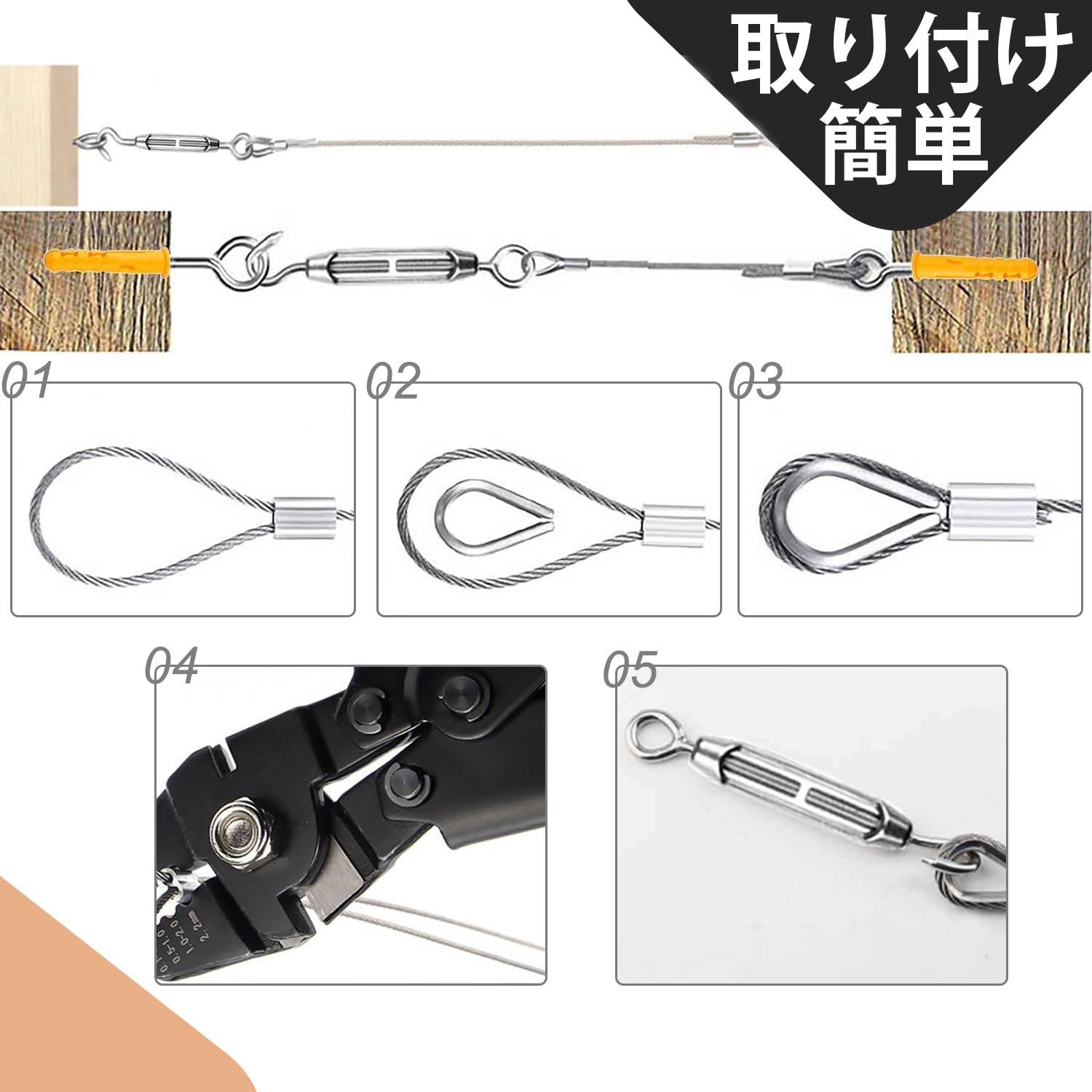 【簡単な取り付け方】いろんな取り付けがあります。①必要に応じてワイヤーカッターを使って適切なワイヤー長さにカットできます。②十分な付属品を入れて、お好きなように組み合わせていただけます