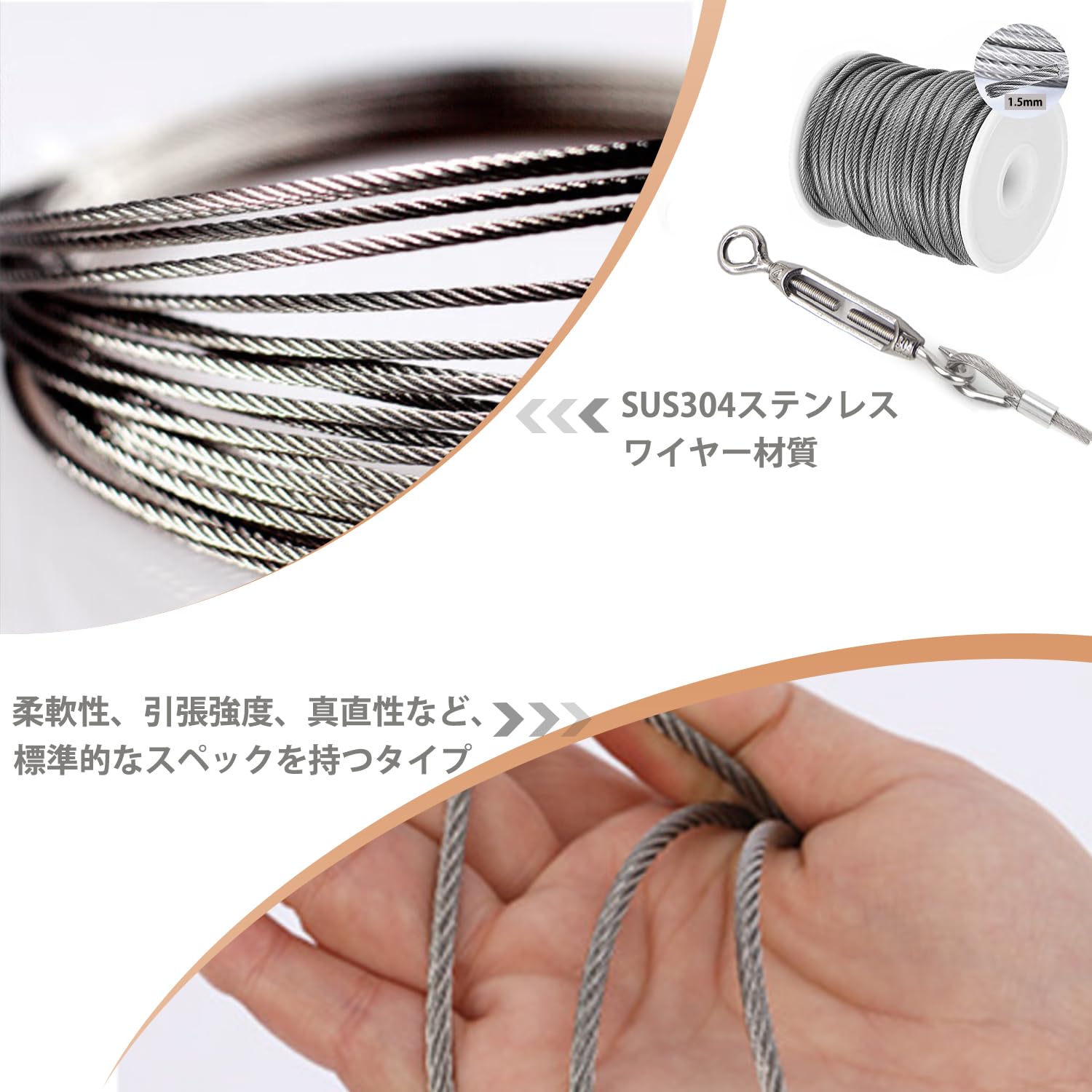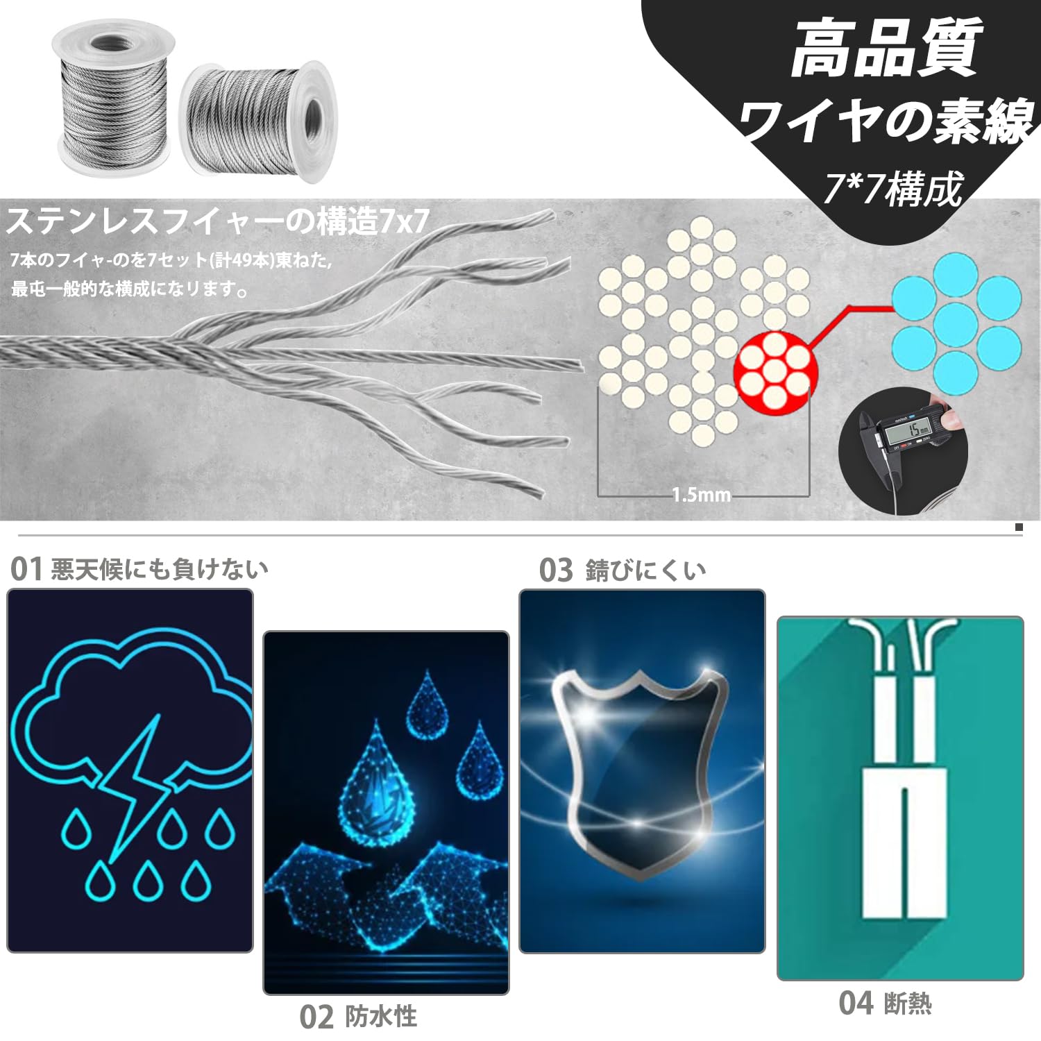 【ステンレスワイヤー材質】高品質のSUS304ステンレス製で、耐食性、耐温度性、良い柔軟性、引張強度に優れます。1.5mm ステンレスワイヤーの構造は7×7(計49本)、直径1.5mmの参考切断荷重は1.61kN(167kgf)、般的な柔らかいワイヤーに比べ約10倍の寿命があります。7×19より硬いので、直線での使用に適しています