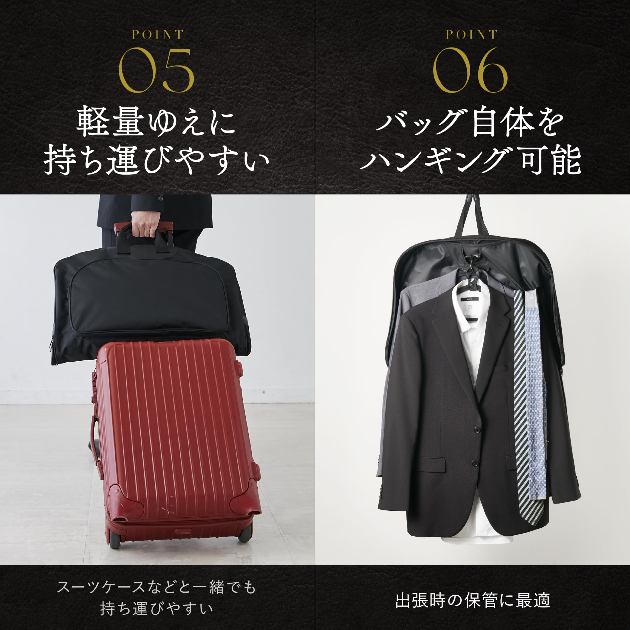 ■【出張の多いビジネスマンを助ける一品】 スーツにしわをつけることなく運ぶために必要なガーメントバッグ、出張や冠婚葬祭など、スーツを持ち運ぶ機会の多いビジネスマンにとっては必需品といえる。このガーメントバッグなら、すべてのビジネスウェアをひとつに収納できるから、何かと忙しいビジネスマンにとって、頼もしい相棒となるだろう。このバッグひとつでスーツ、ワイシャツ、靴下、ネクタイ、折りたたみ傘などをまとめて収納できる。長めの出張や冠婚葬祭の場合、スーツが一着だと、どうしても不安になる。だからこそ、できるビジネスマンはガーメントバッグを用意し、替えのスーツを用意するのだ。このバッグがあれば、スーツがしわになりこともなく、常に新鮮な状態で運べる。忙しいビジネスマンは必携の逸品だ。