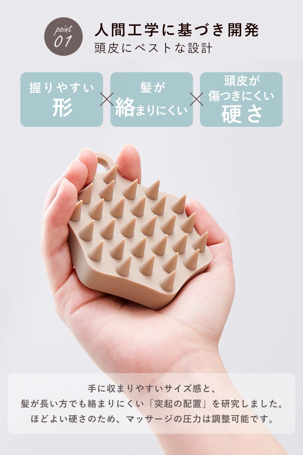 ?【 頭皮にベストな設計 】人間工学に基づき開発しました。 ★握りやすい「形」 ★髪が絡まりにくい「突起の配置」 ★頭皮が傷つきにくくマッサージ圧力を調整できる「硬さ」★シリコン樹脂で優れた「撥水性」
