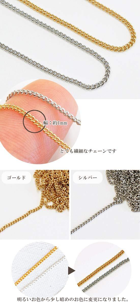 極細のチェーンです。 シンプルなデザインなので どんなチャームでも相性抜群♪ レジンの封入やネイルパーツにもお使い頂けるチェーン。 販売のCカンをお使いいただけましたら アクセサリーチェーンとしも♪ ネックレスやブレスレットのチェーンにはもちろん ピアスやイヤリングなどのパーツとしてもお使い頂けます♪ 1mカット済みなので お好みの長さに合わせてお作り頂けます♪