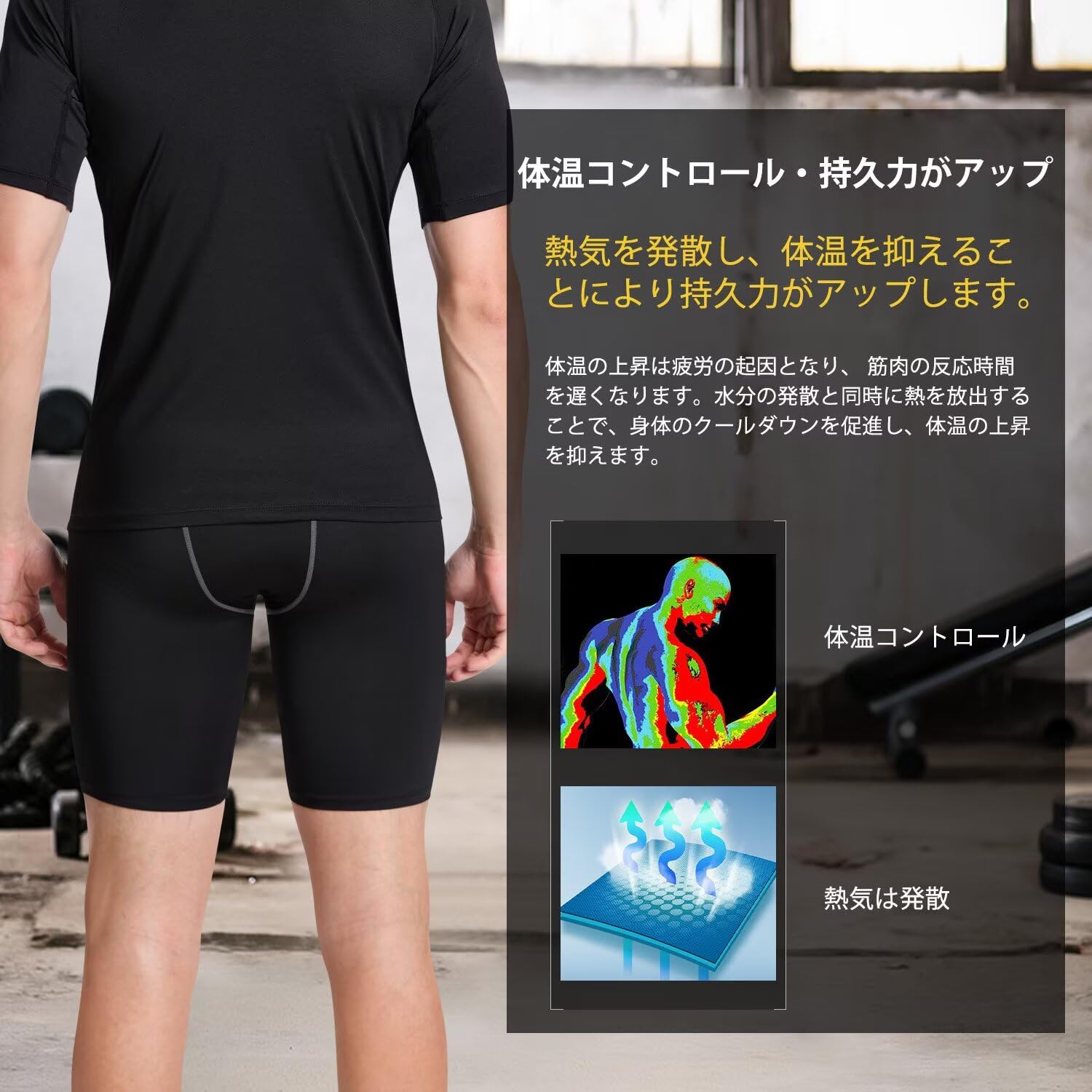 パワーストレッチ:伸縮自在で肌に密着するパワーストレッチが適度な圧力を体にかけることにより、血行を促進し、筋肉の無駄な動きをおさえ、正しい筋肉の使い方のサポートできます。