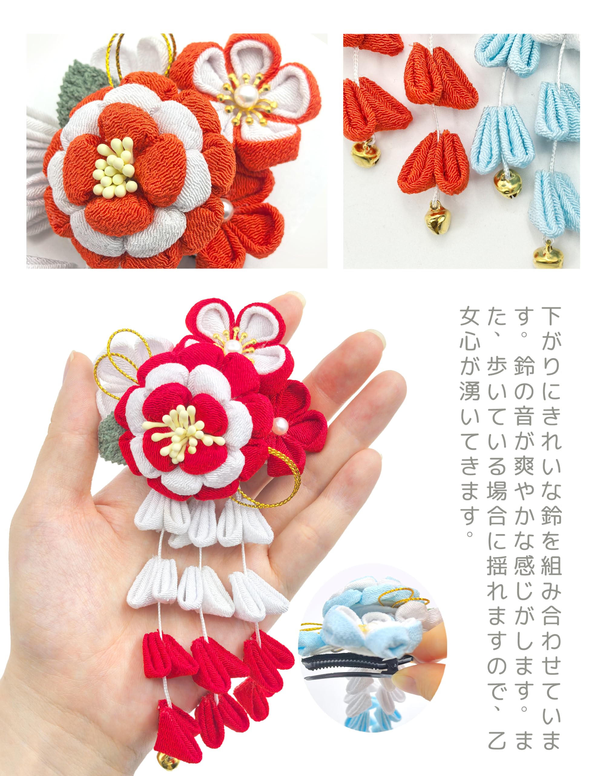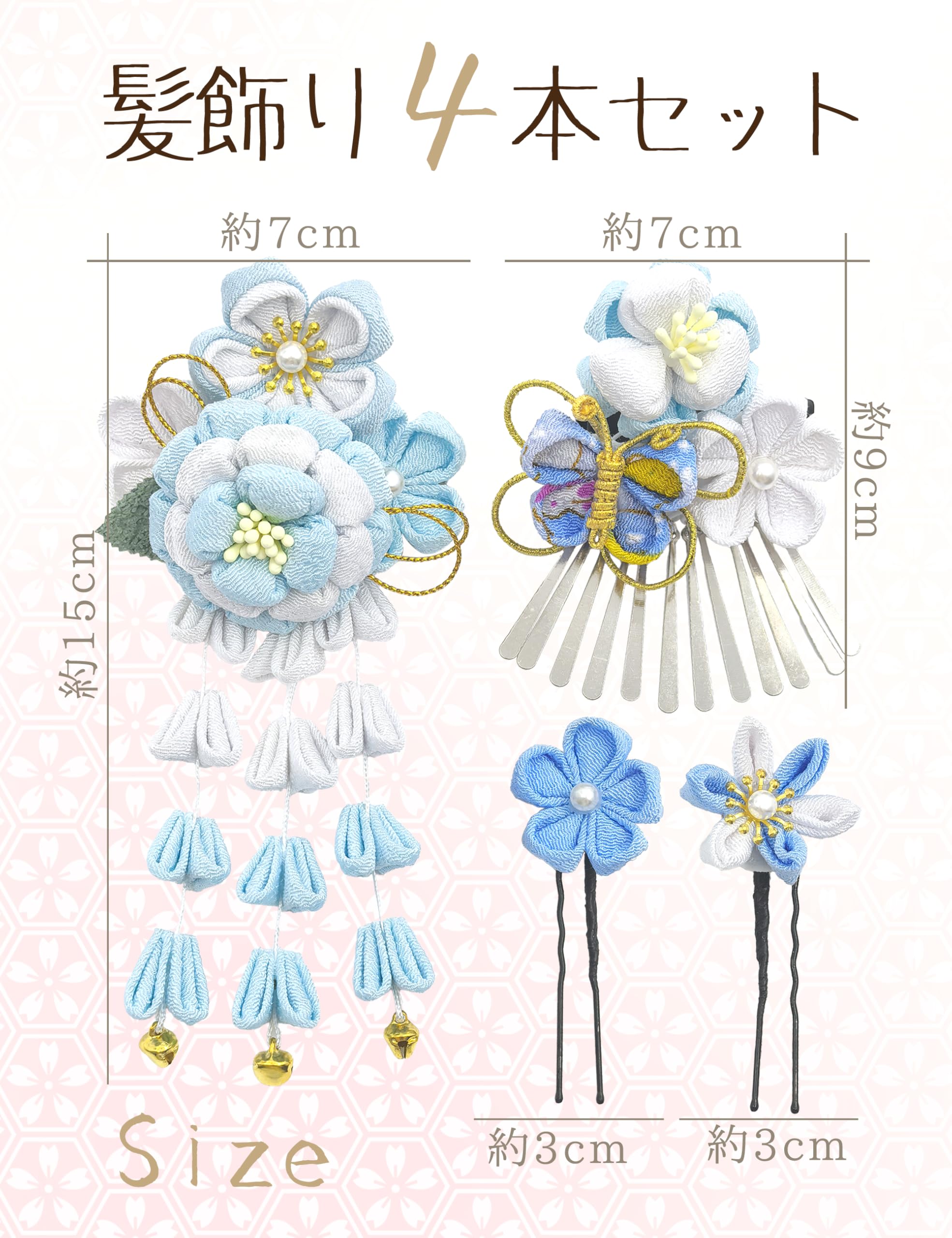 【デザイン】大花かんざし、櫛型かんざし、小花のヘアピン2本を含む4本セットで、浴衣や振袖などの和装はもちろん、普段のヘアアレンジにも合わせやすいアイテムです。