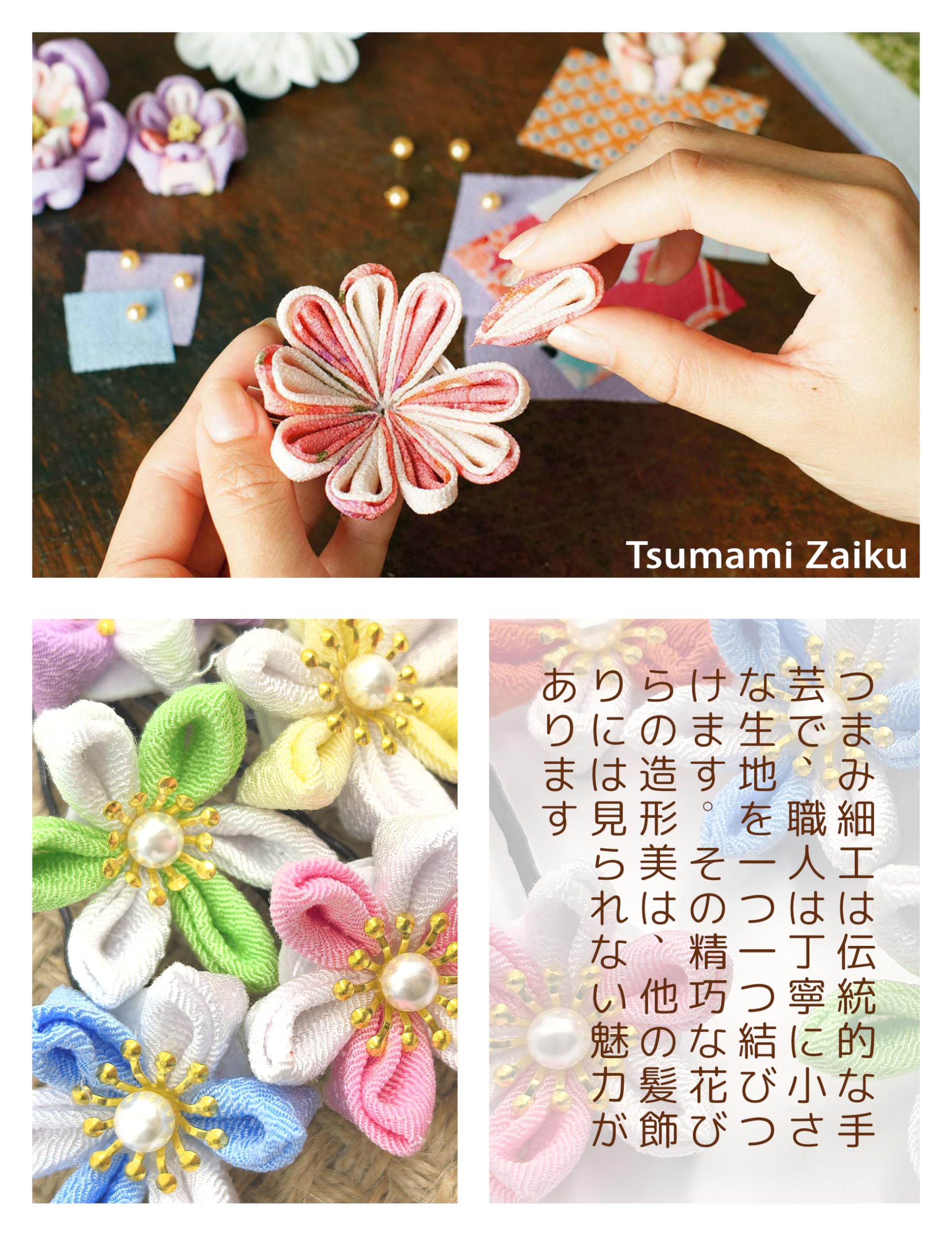 【つまみ細工】伝統工芸のつまみ細工で一枚ずつ丁寧に仕上げた花は、職人の手仕事ならではの温かみと個性が感じられます。