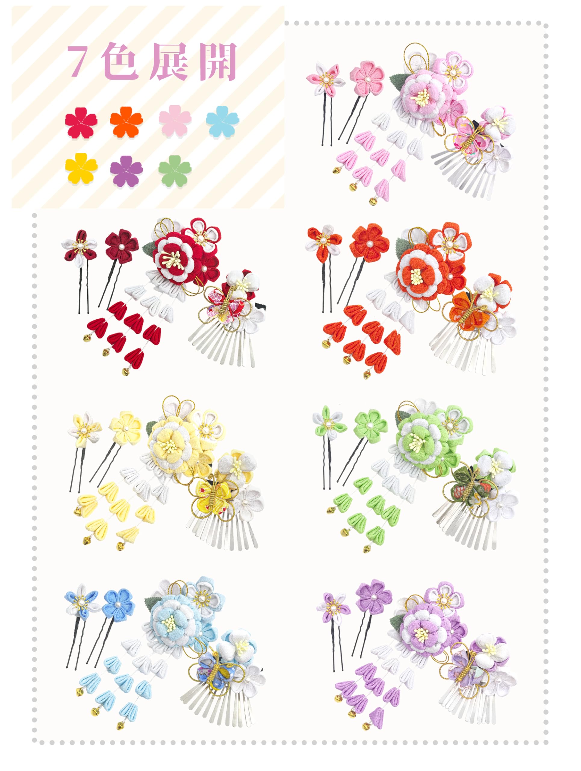 【カラー】七五三、花火大会や卒業式など多様なシーンにふさわしく、ピンク・ホワイトの7カラーが、髪型やファッション、和装スタイルに合わせて唯一無二の彩りを演出します。