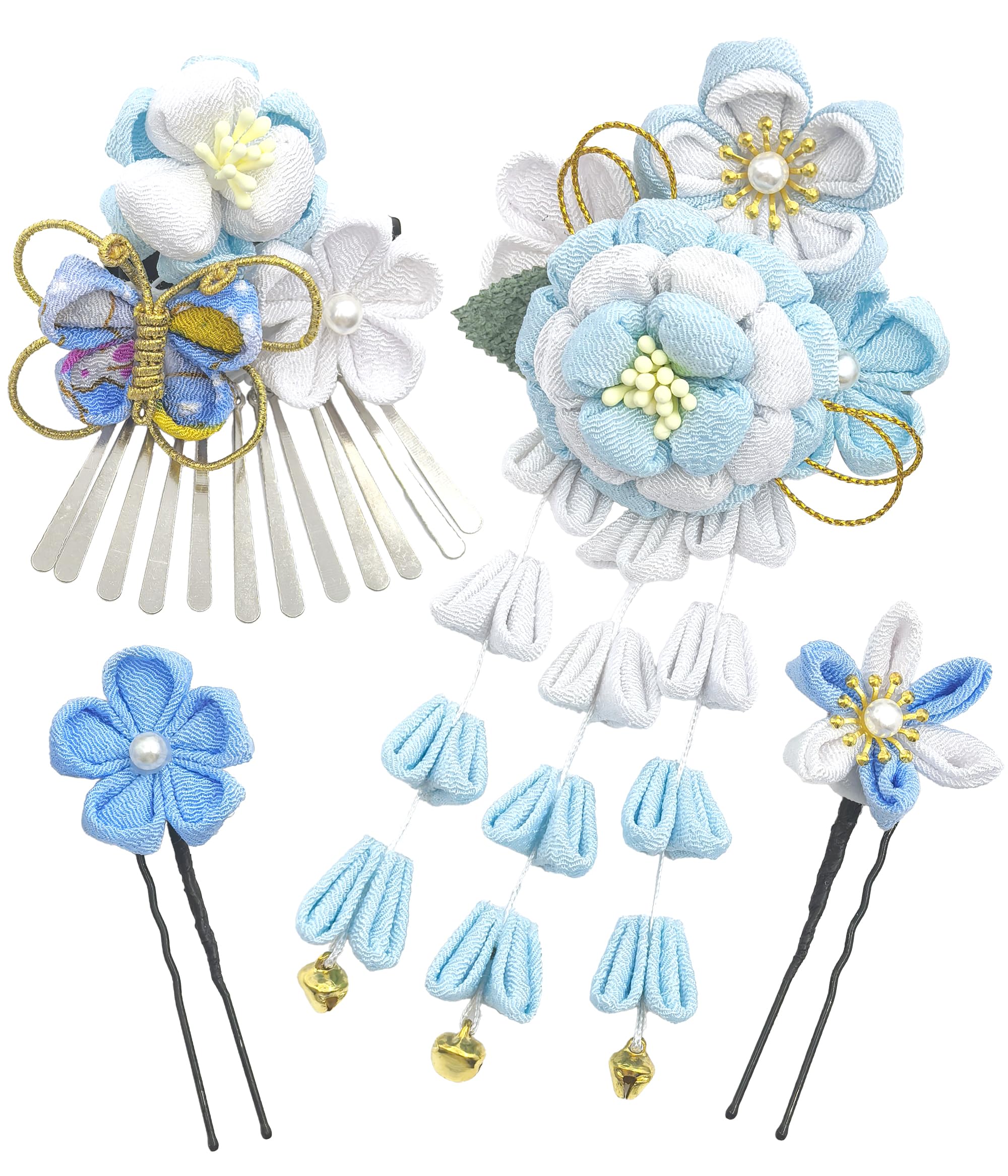 [Jzoon] 髪飾り 蝶 4点セット 成人式 七五三 卒業式 結婚式 浴衣 袴 振袖 和装 手作り つまみ細工 花 鈴付き 青 H2115