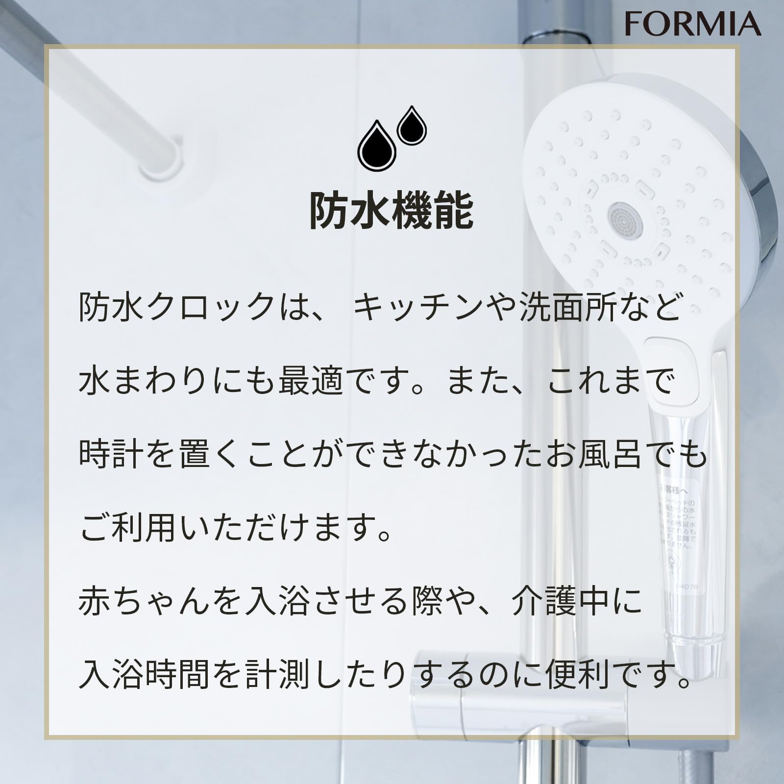 防水クロックは、 キッチンや洗面所など水まわりにも。また、これまで時計を置くことができなかったお風呂でもご利用いただけます。 赤ちゃんを入浴させる際に時間を確認したり、介護中に入浴時間を計測したりするのに便利です。