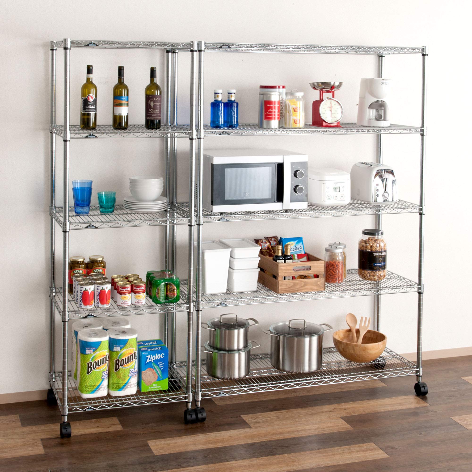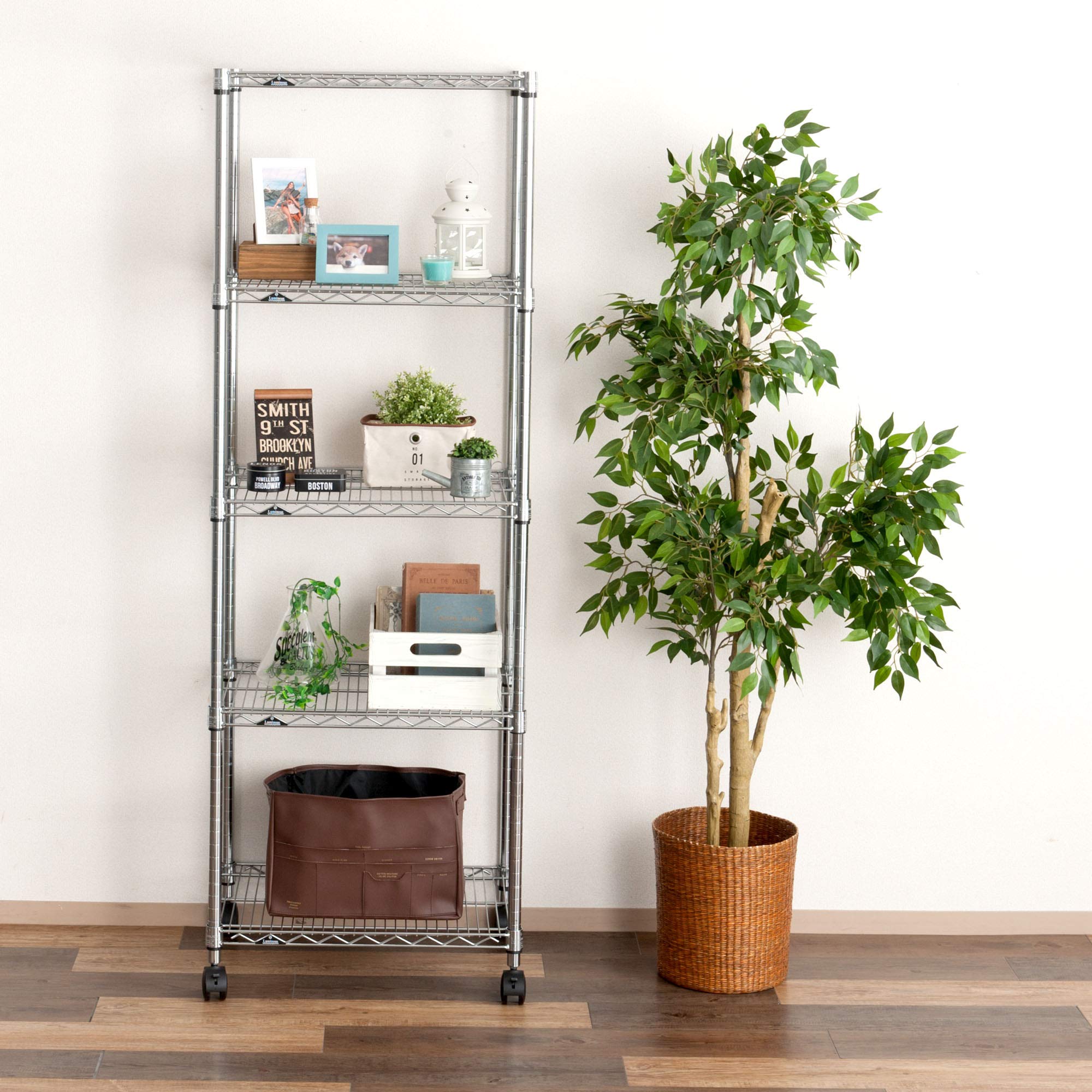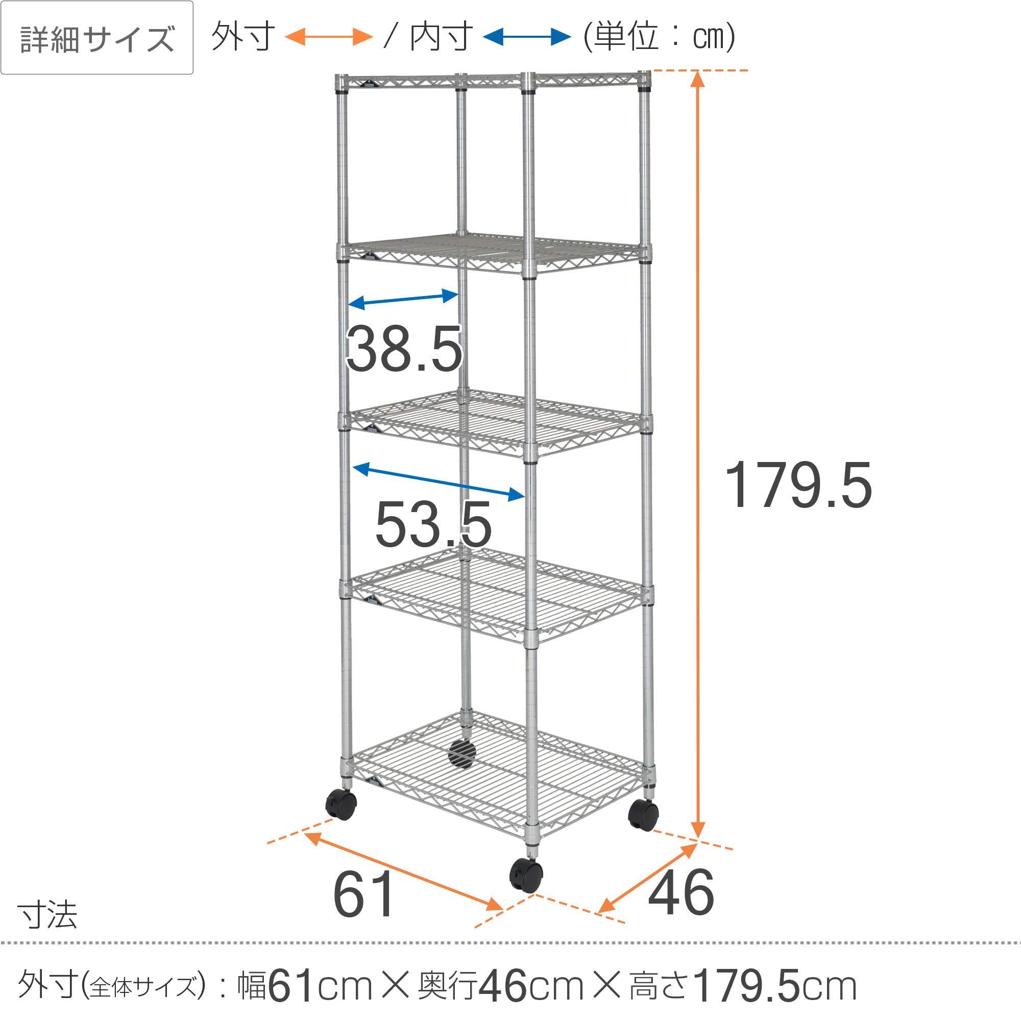 ●幅(約)61X奥行き46X高さ179.5cm●ポール径:25mm●棚一枚あたりの耐荷重 約250Kg●防さび加工(クリアコーティング仕上げ)●材質シェルフ(棚)・ポール:スチール(クロームメッキ)スリーブ:ABS樹脂●付属パーツ:標準アジャスター・ナイロンキャスター●棚の高さは約2.5cm間隔で調節可能●お客様組み立て品です。●ご注文間違い等のお客様都合による返品・交換はお受けできませんので寸法等、十分にご検討のうえご注文下さい。