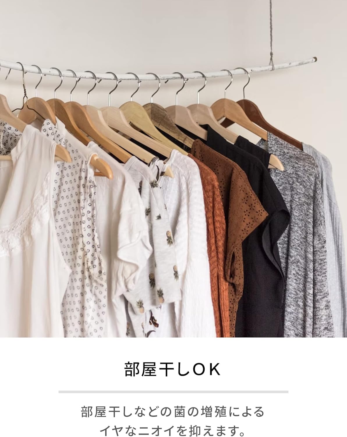 独自の柔軟成分が衣類の繊維にやさしく働きかけ、肌触りをなめらかに整えます。静電気を抑え、ホコリや花粉の付着も防ぐため、部屋干しでも清潔感を保てます。