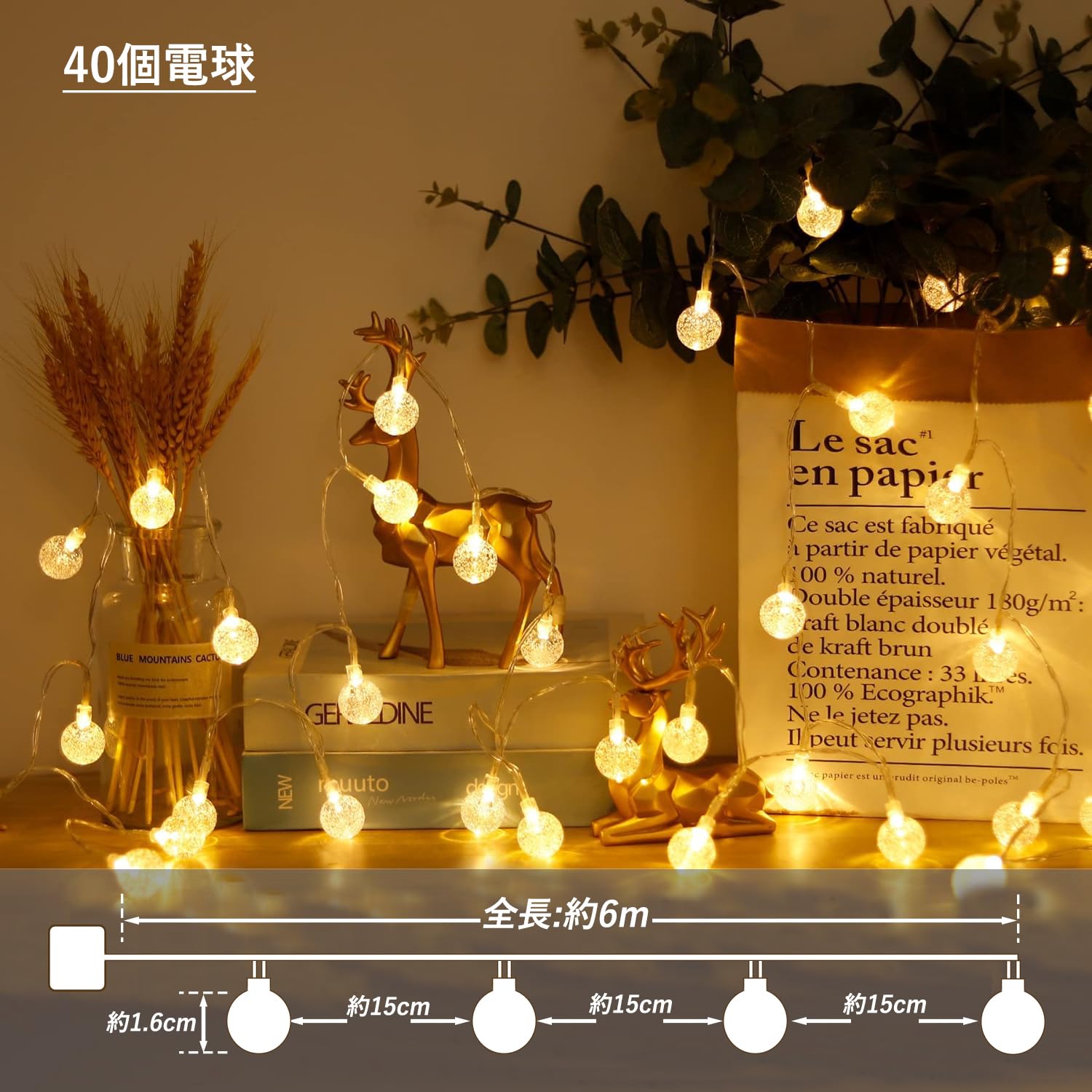 【新着】フェアリーライト LED電球 イルミネーションライト 6m 40灯 電池式 点滅/点灯切替 防滴防塵 コードレス 屋内屋外両用 ガーデン・キャンプ装? クリスマス・誕生日・結婚式 雰囲気灯(透明気泡電球・暖色・電池給電) | GIGATERA